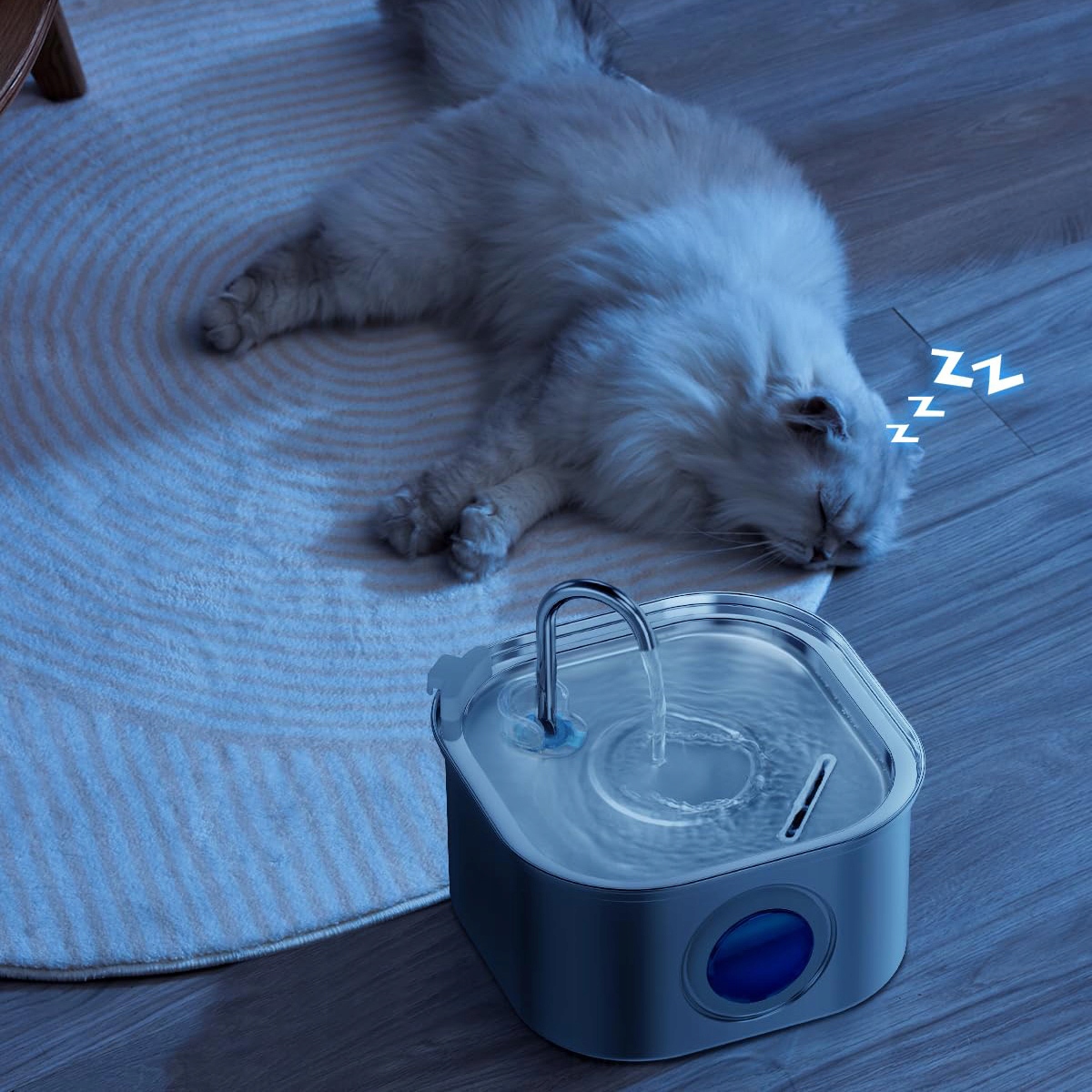 Цей внутрішній фонтан для котів оснащено візуальним віконцем рівня води, а водяний насос оснащено м’яким синім світлодіодним світлом. Це дозволяє вам легко відстежувати зміни рівня води в точці водопою в будь-який час, що робить цей котячий фонтан корисним інструментом для спостереження за здоров’ям вашого вихованця.