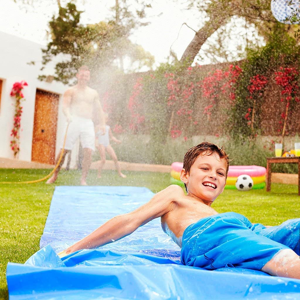 Щоб почати веселощі, просто надуйте дошку, краї гірки та підключіть водяний шланг.