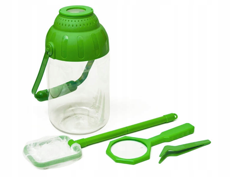 Пластикове відро з ручкою та кришкою з лупою всередині. Спійманих комах, плаваючих риб або рослин можна ретельно оглянути і вільно переміщати. Кришка має вентиляційні отвори, що робить відро безпечним для комах. Велика ємність зі збільшувальним склом у кришці ідеально підходить для спостереження за водними істотами в їхньому природному середовищі. Діти можуть ловити різними водяними комахами за допомогою сачка, а пінцет стане в нагоді для їх перенесення.