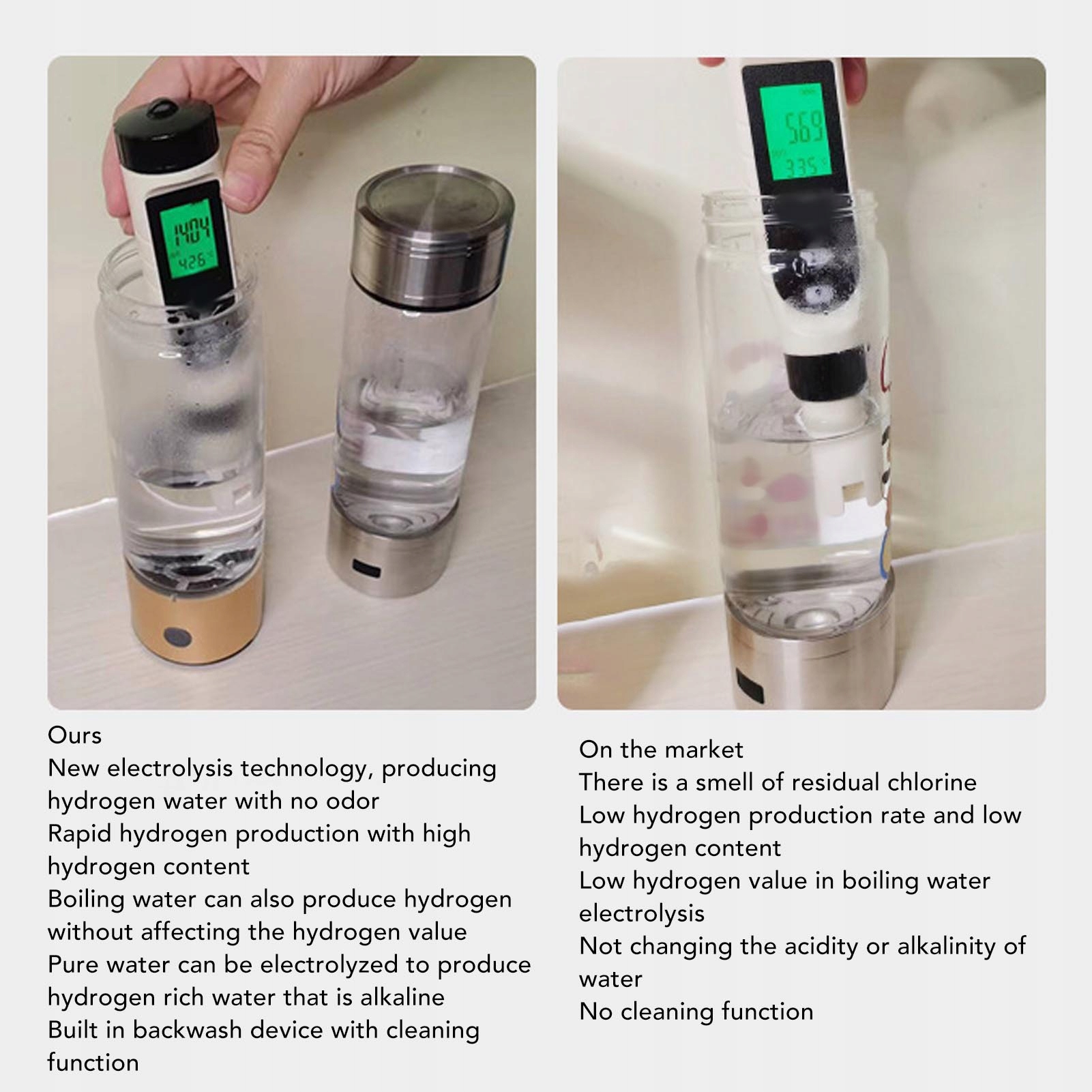 1. [Портативний генератор водневих вод] Ця пляшка водневої води дозволяє насолоджуватися воднем, багатим водою в будь -якому місці та часу. Він швидко генерує іони водню до 1200 до 1400 проміле (1,2 проміле) за один цикл.