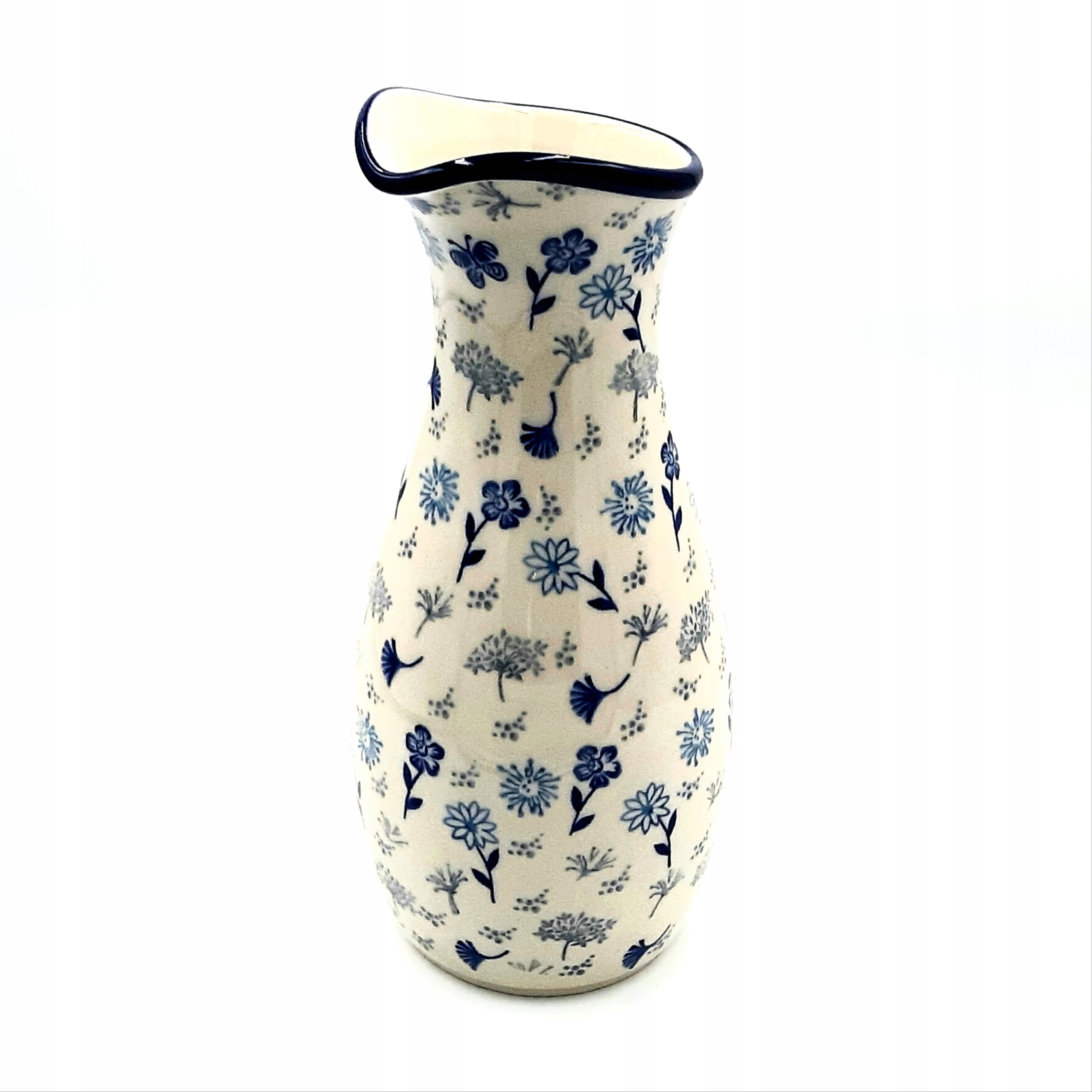 Carafe/ Vase , виготовлена з Болеславеєка, є елегантною і функціональною vessel, яка ідеально підходить до традицій рукуни. Зроблено з високоякісною глиною, покритою характерною, блискучою глазур'ю в відтінках синього та сірого кольору, прикрашених руками, розфарбованими квітковими мотивами. полиця або таблиця.