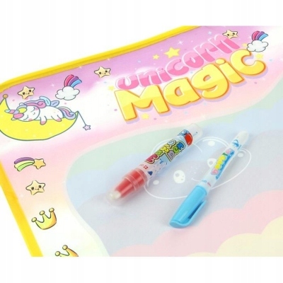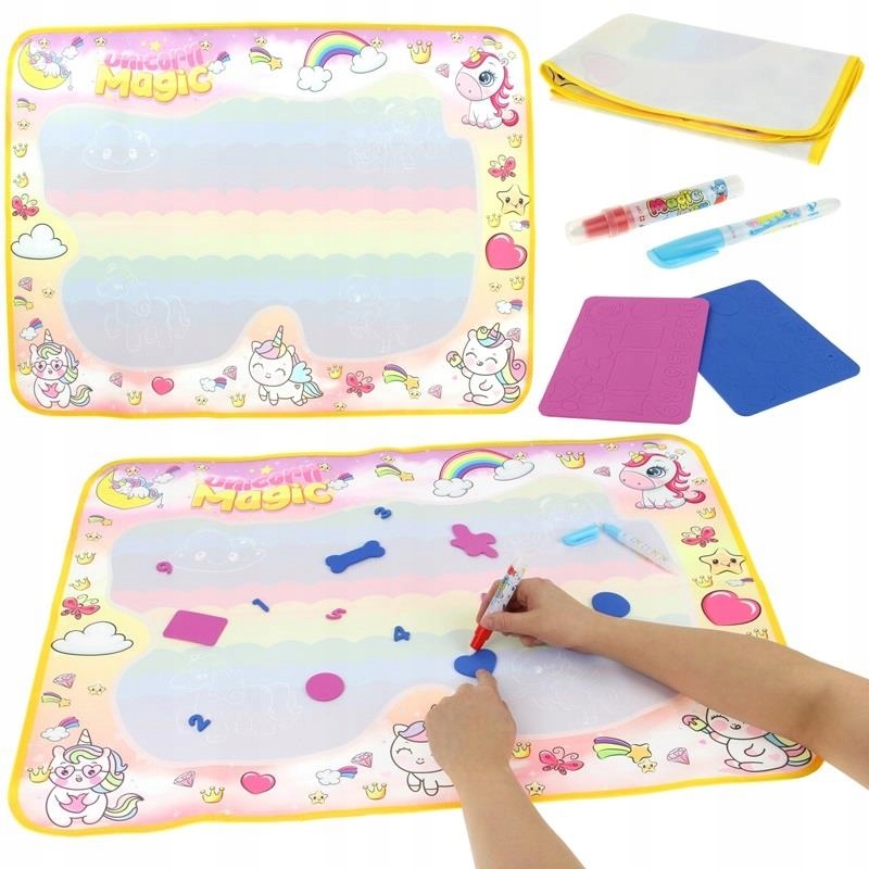 Водний килимок - це сенсаційне рішення для нескінченного створення малюнків. Завдяки водяній ручці, ваша дитина зможе намалювати та малювати за бажанням. Просто наповніть фетрову ручку водою і намалюйте все, що завгодно. Після того, як малюнок висушить, картини зникнуть, і ви можете ще раз малювати. Thanks to the templates included in the set, you can draw different shapes on its surface.