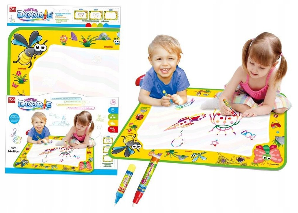 Величезний водяний килимок для малювання водної каракулі XXL + водяна ручка без кінця! Принцип килима води надзвичайно простий - матеріал, змочений водою, означає, що кольори з’являються на ньому. Після написання щось з маркерами води, візерунки залишатимуться прозорими протягом декількох хвилин, а потім зникнуть. Завдяки цьому, належним чином збережений килимок можна використовувати назавжди! Як використовувати водні маркери: відкрутіть кінчик ручки, налийте в неї воду, ретельно поверніть кінчик, фарбуйте! Килимок легкий, зручний і складений, тому ви можете легко відвезти його до саду, парку, дитячого садка, друга чи колеги, а також у поїздку чи свята. Дно - це водонепроникна, тому ви можете поставити його, наприклад, на мокру траву. Після прокатки він займає дуже мало місця, тому його легко зберігати навіть у маленькій кімнаті. Розміри водяного килима: 72 см х 48 см упаковки Розміри: 47 см х 35 см х 2 см. Килимок можна використовувати для незалежних та дорослих розваг, а також для розваги у більшій групі. Килимок чудово підходить для подарунка як для хлопчиків, так і для дівчаток. Це, безумовно, принесе посмішку багатьом обличчям! Водний килимок - чудовий вибір для вашої дитини. Він довговічний, виготовлений із безпечних та екологічних матеріалів. Іграшки абсолютно безпечні завдяки суцільній конструкції та правильній обробці.