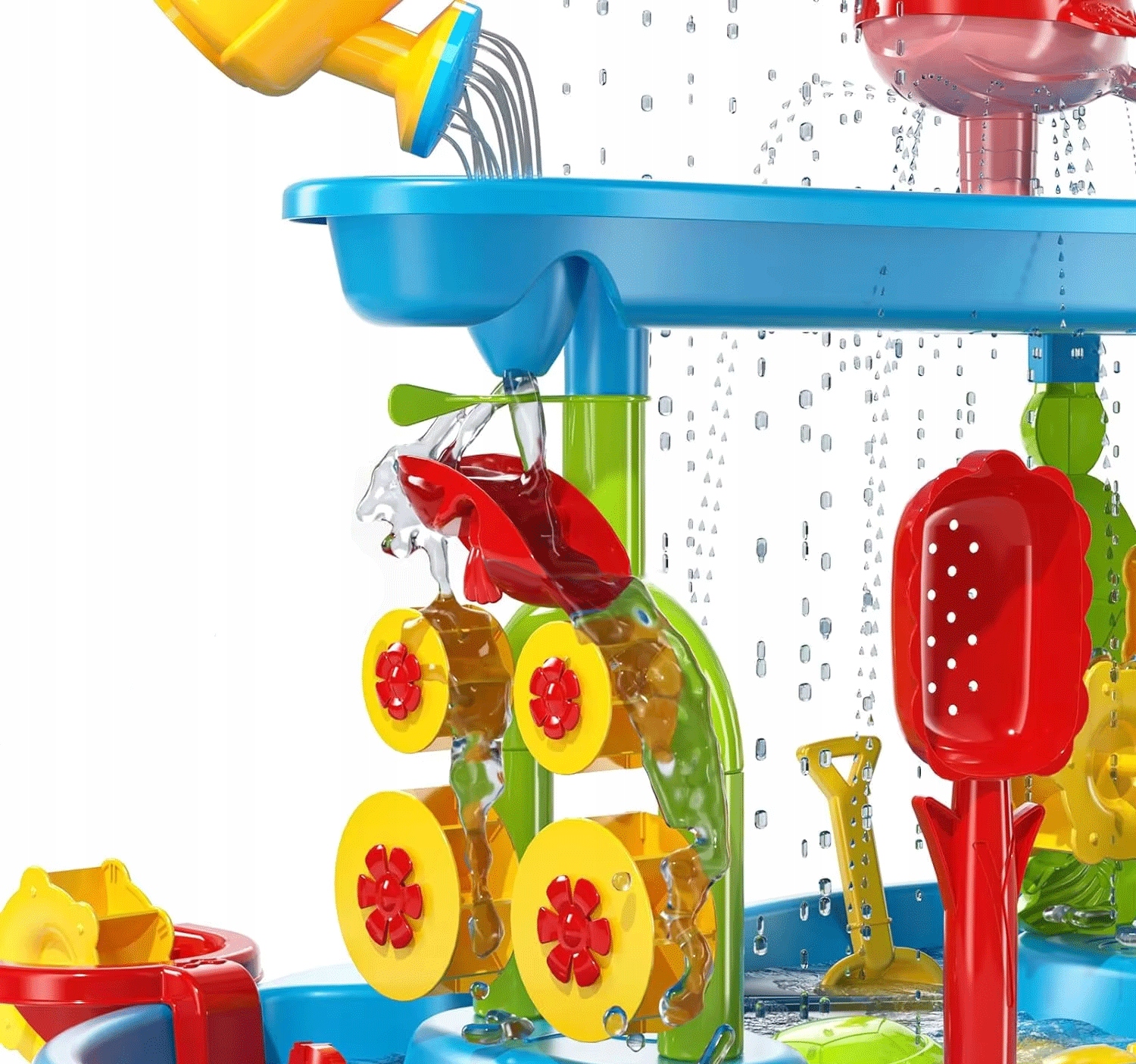 ідеально підходить для гри з водою та піском, перенесе ваше задоволення від заднього двору на абсолютно новий рівень. У ньому багато аксесуарів: поливу, відро, водяна гармата, лопатки, кити, водні колеса, форми та інші.