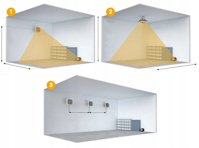 Обігрівач VOLCANO містить монтажну консоль, яка дозволяє встановлювати пристрій як вертикально(1), так і на стелі(2). Максимальна вертикальна дальність роботи приладів коливається від 8-15 м в залежності від типу обігрівача. Максимальний горизонтальний діапазон становить 14-25 м. Недотримання мінімальної відстані 25 см (VR Mini) і 35 см (VR1/VR2/VR3/VR-D) від стіни або стелі під час встановлення може призвести до неправильної роботи пристрою, можливе пошкодження вентилятора або підвищення гучності його роботи. Можлива установка групи приладів(3).