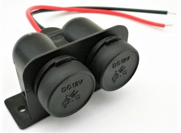 - Водонепроникна подвійна електрична розетка 12В 15А в гумовому корпусі з двома виходами. З'єднувальні кабелі довжиною приблизно 10 см.