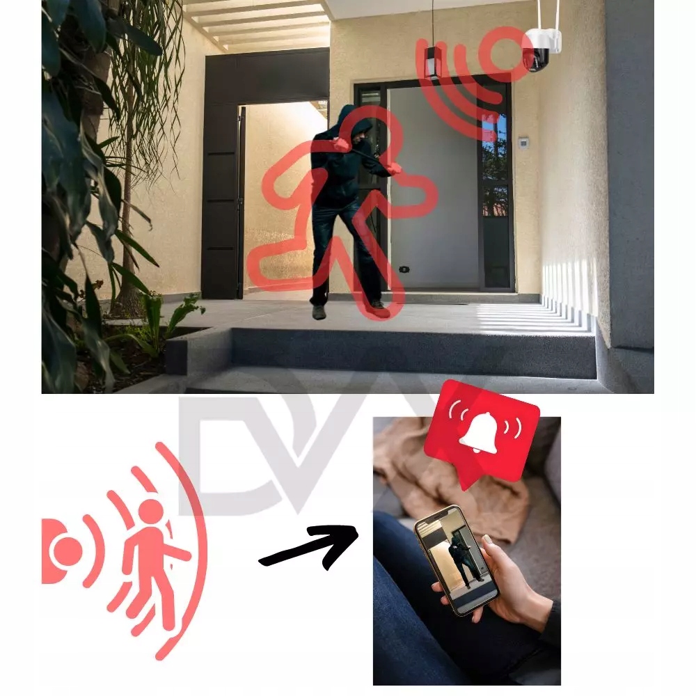 Камера дозволяє встановити сигналізацію, яка буде спрацьовувати при вході людини в зону спостереження. Ви можете вибрати тип сповіщення, яке буде надіслано, відповідно налаштувавши будильник: це може бути сповіщення телефоном, сповіщення електронною поштою, сирена тривоги, голосові повідомлення тощо.