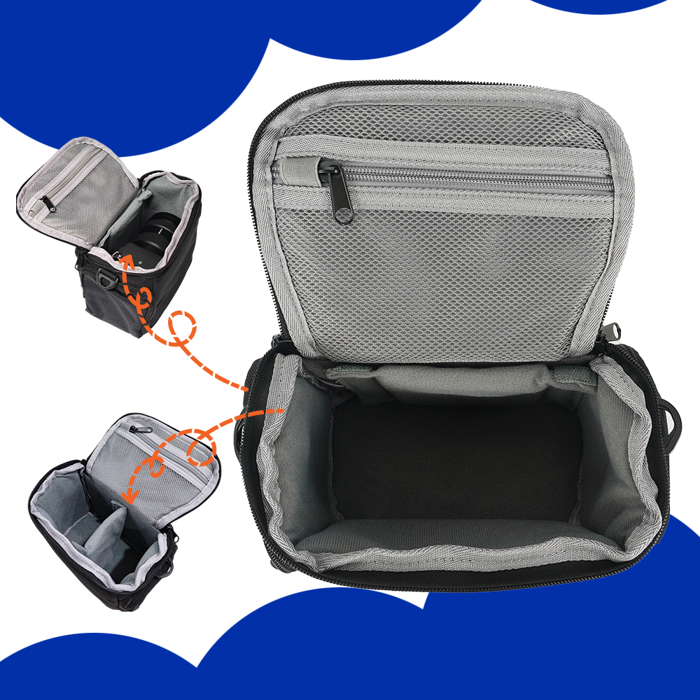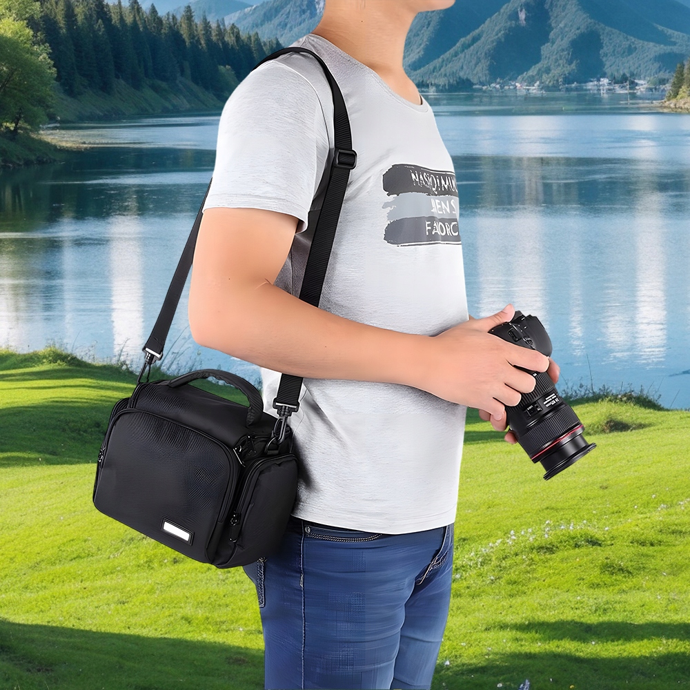 - 📸З основним відділенням, двома бічними кишенями та однією передньою кишенею він достатньо великий, щоб вмістити камеру та різні аксесуари.