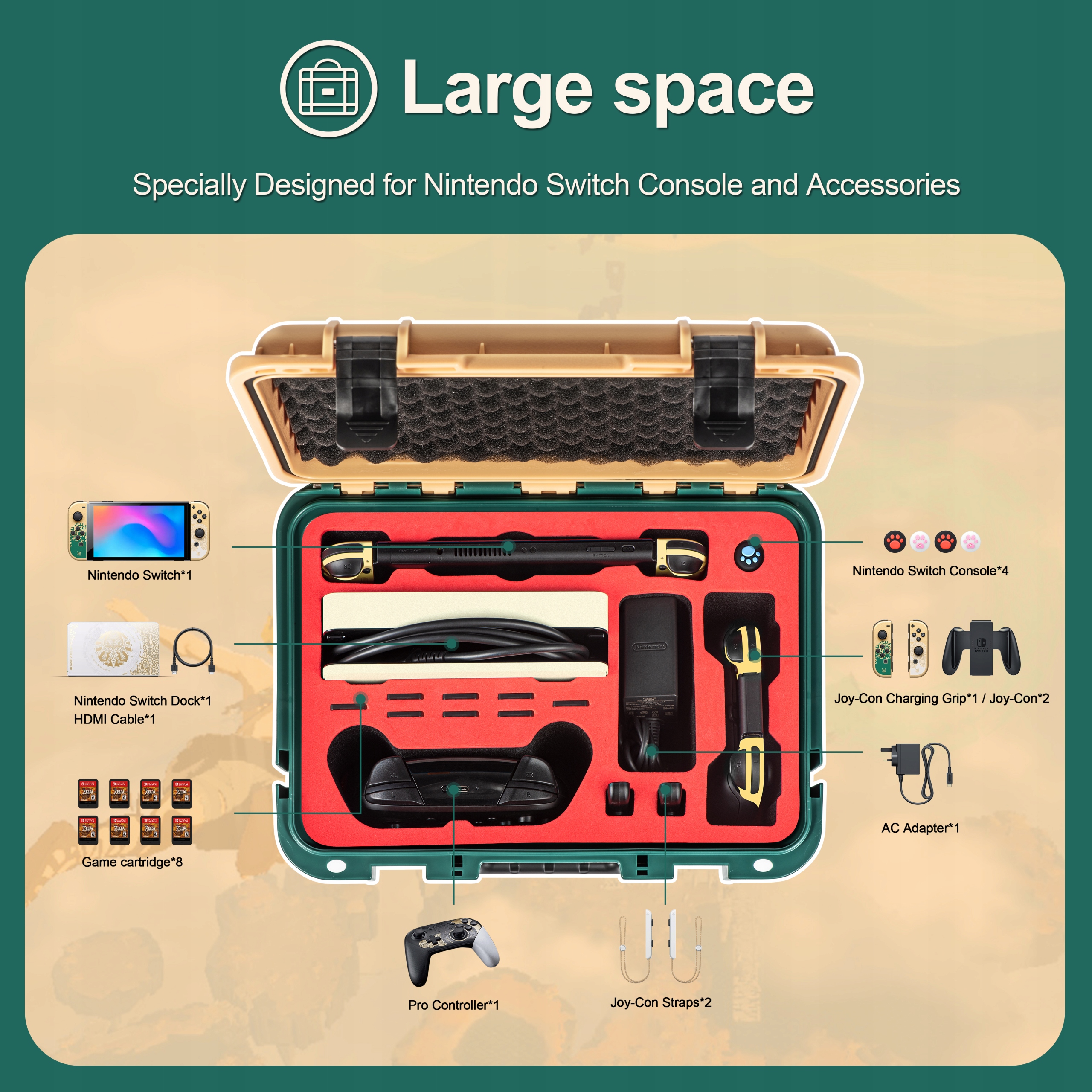 【Велика місткість】Чохол Nintendo Switch має велику місткість, внутрішні пази надійно тримають консоль Nintendo Switch, включаючи Pro Controller, док-станцію Nintendo Switch, Зарядна рукоятка Joy-Con, адаптер змінного струму, ігровий картридж, кабель HDMI, ремені Joy-Con тощо.