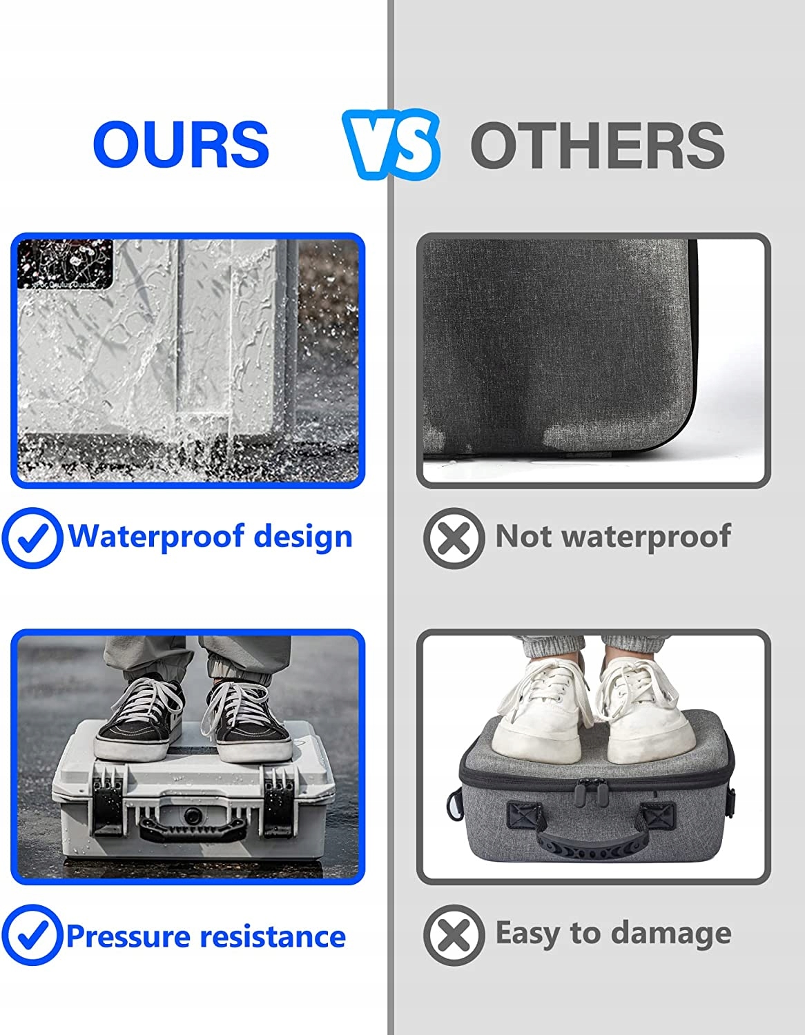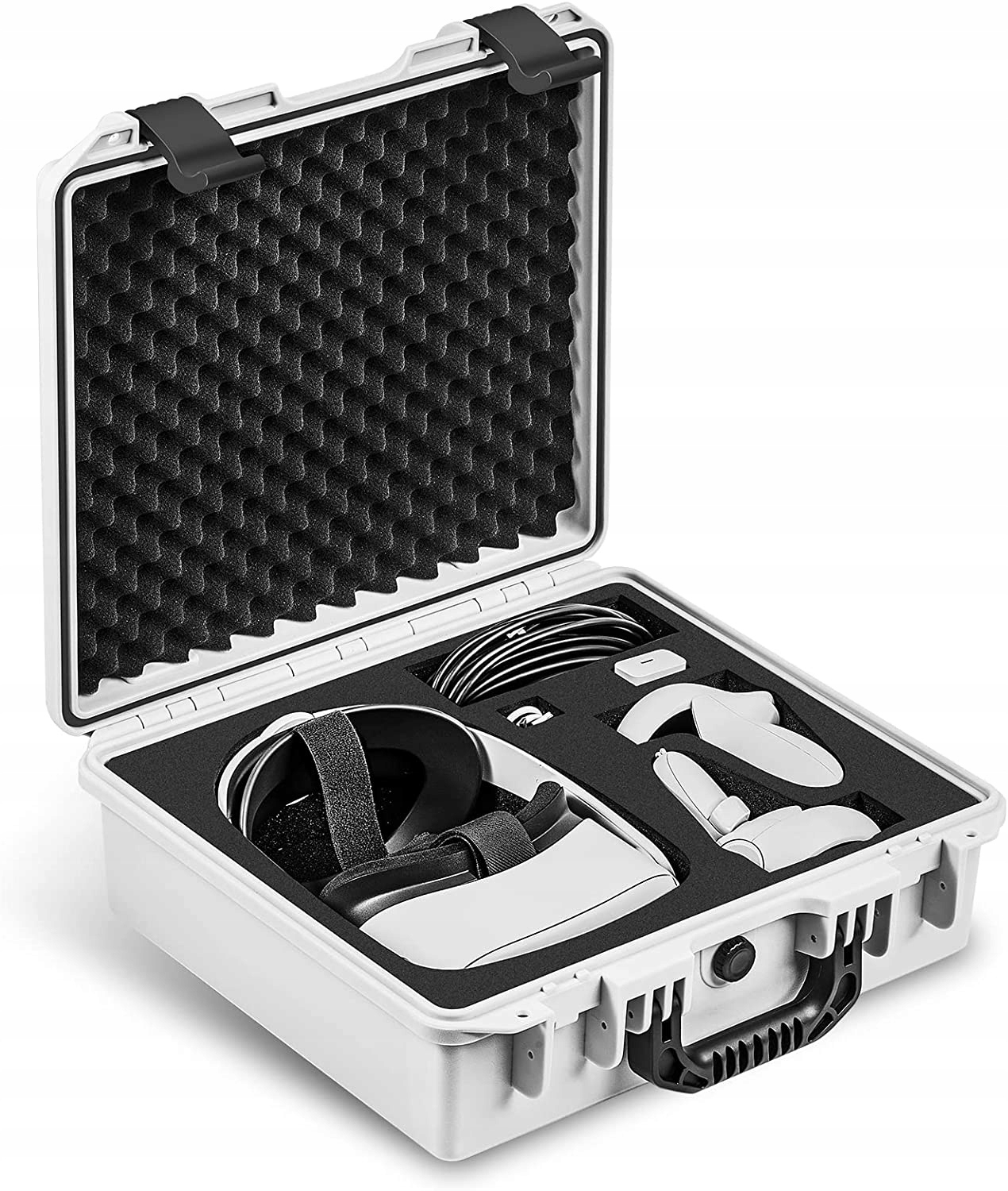 【Надійний захист】Водо- та пилонепроникний за стандартом IP67. Дві засувки надійно закривають корпус за допомогою стискаючої сили. Ідеальний захист гарнітури Meta Quest 2 VR і аксесуарів від подряпин, ударів і бризок. Зберігайте гарнітуру Meta Quest 2 VR та інші аксесуари в безпеці під час подорожі чи транспортування, незалежно від погодних умов або місця, де ви йдете.