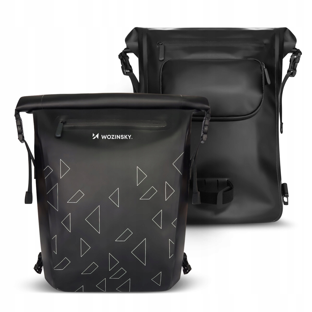 Сумка Wozinsky має унікальний мінімалістичний дизайн. Чорний колір контрастує з характерними для бренду Wozinsky сріблястими трикутниками. Вибір сріблястого кольору не випадковий - це світловідбиваючі елементи, які будуть помітні під час їзди вночі. Світловідбиваючі смужки також можна знайти на ручках рюкзака.