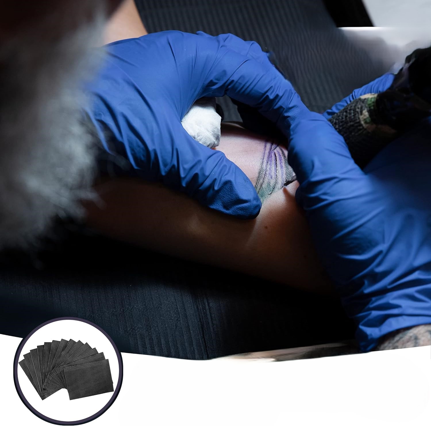 50 шматочків прокладок для татуювань, одноразові нагрудники/ аксесуари для татуювань, водонепроникні, стерильні прокладки, татуювання, для робочого місця, чорні татуювання, аксесуари (33 х 45 см) 2 шару паперової тканини та 1 шару міларної фольги на задній частині. Сальванти/татуювальні пластівці є водонепроникними, поглинають воду, туш та інші рідини, не протікаючи і не залишаючи слідів на шкірі, одязі, столах тощо
