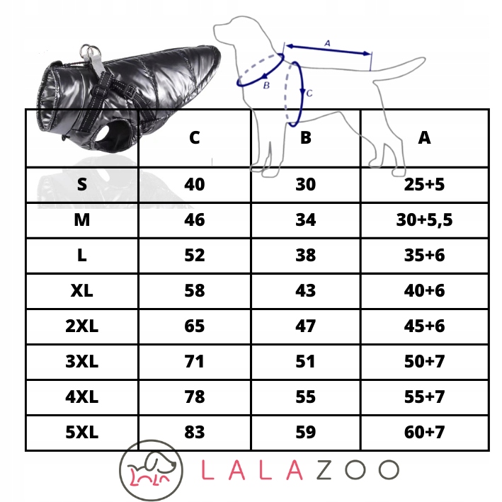 Спочатку ми перевірте розмір грудей (C), потім довжину спини (A) і, нарешті, обхват шиї (B/) найменш важливий, оскільки може бути деяка вільність ;) - пам’ятайте, що в таблиці наведені максимальні значення, і будь-яка вільність може компенсується еластичною стрічкою в області живота