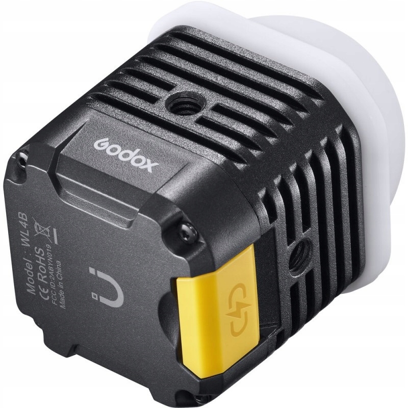 Водонепроникний світлодіод Godox WL4B-це невеликий куб з стороною близько 5 см, сильне джерело денного світла 5600 к і може бути встановлений практично в будь-якому місці завдяки отворам 1/4 "-20 та магнітним кріпленням.