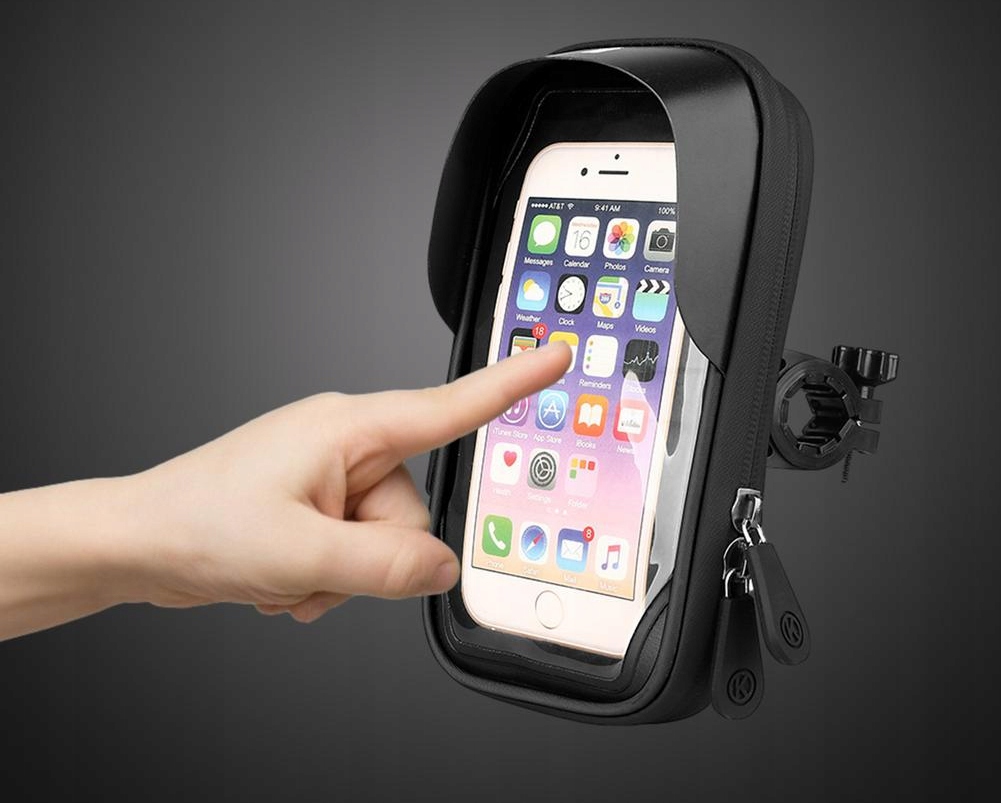 Кришка водонепроникна, щоб її можна було використовувати в будь -яких погодних умовах. Захищає від води, бруду та пилу. Він кріпиться двома блискавками. Найбільша його перевага - це сонячне покриття для кращої видимості екрану під час інтенсивного сонячного світла. Ще одна перевага - навушники або силовий кабель збоку. На обкладинці є дві кишені для кредитних карток, документи, а також замок, в якому можна приховати, наприклад. Установка проводиться за допомогою регульованої рульової ручки в наборі . Можна нахилити корпус і повернути 360 градусів. прозорий тактильний пластик дозволяє використовувати телефон, не знімаючи його з кришки. Телефон на обкладинці кріпиться на липучках. 2 см