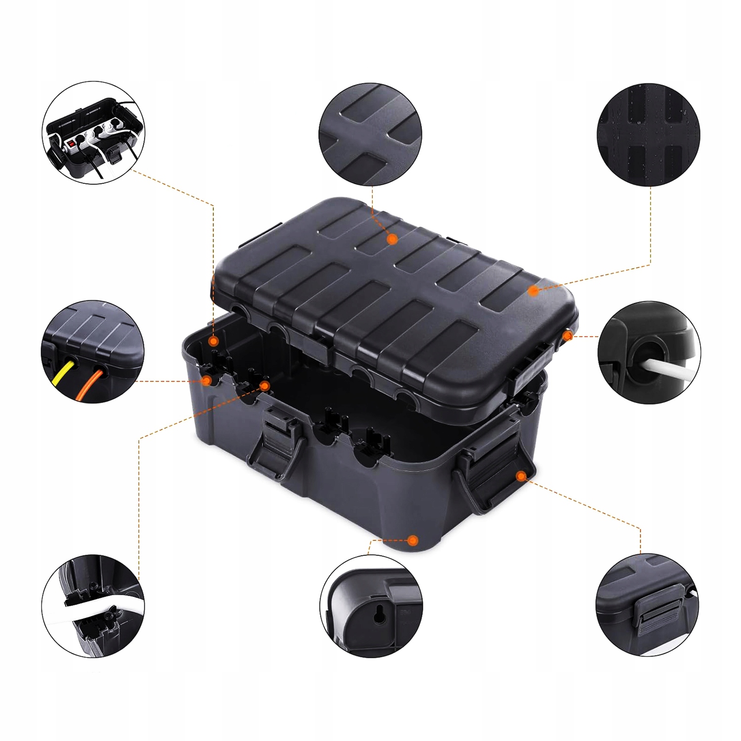 Створено для безпечного тимчасового зовнішнього кабельного з’єднання. Завдяки великим розмірам (34,5 x 24 x 12 см) і 6 кабельним вводам (спереду * 4 + збоку * 2) це комплексне рішення для захисту зовнішніх подовжувачів, розеток з таймером, подовжувачів, великих адаптерів і більшості інших електричних з’єднань.