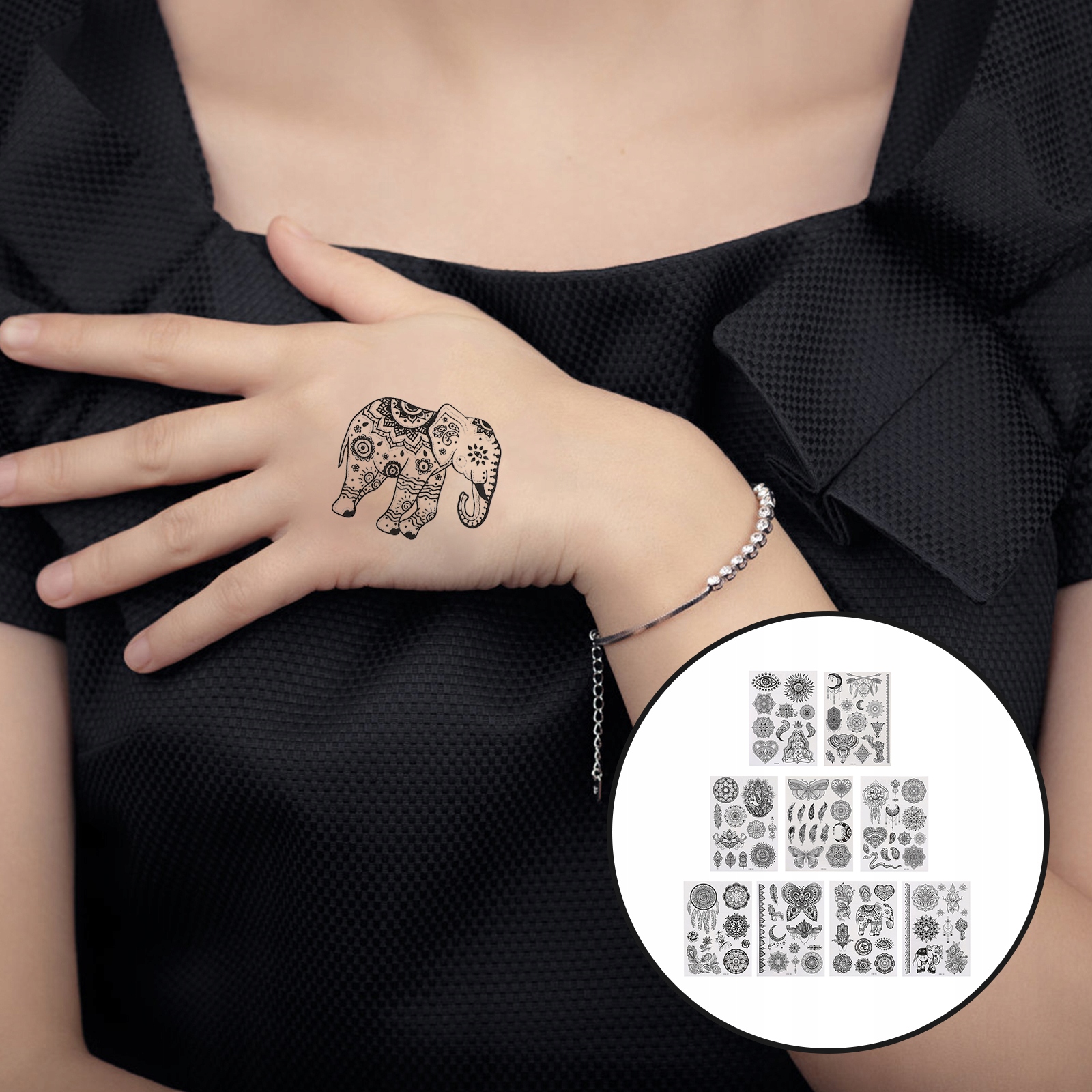 Це набір наклейок татуювань, достатня кількість достатньо для використання. Зроблені з дружнього матеріалу, вони безпечні у використанні. Тимчасові татуювання з вишуканою схемою призначені як для жінок, так і для чоловіків. Ці тимчасові наклейки на татуювання є найкращим вибором для тематичних подій та прикрас.