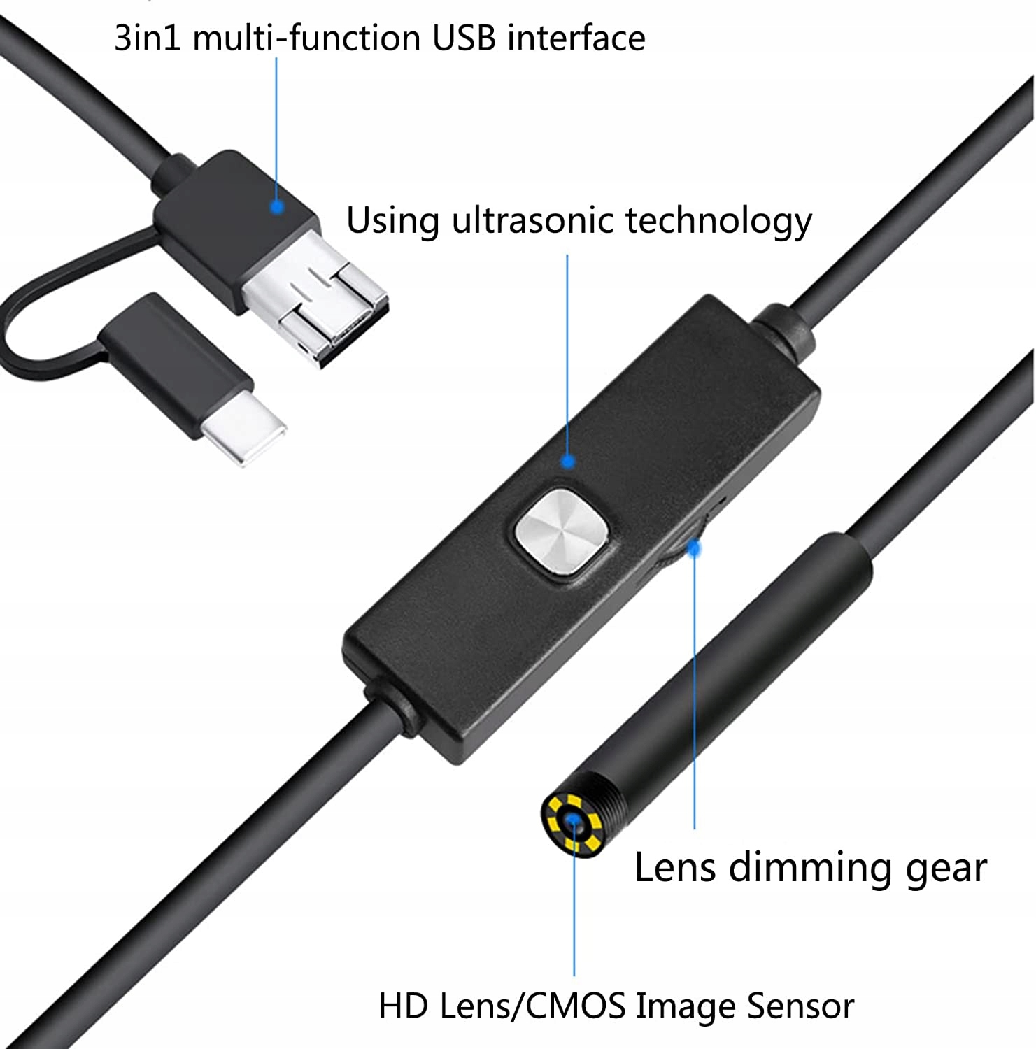 Камера цифрового мікроскопа Підключіть мікроскоп до пристрою через USB, ви навіть можете переглядати зображення мікросвітла на екрані комп'ютера або мобільного телефону без послуги передачі даних. Підтримує функції скріншотів і запису відео. Ендоскоп камери огляду з інтерфейсом 3-в-1 має конструкцію три-в-одному з інтерфейсами Android TypeC та USB, що є більш сумісним і підходить для більшості мобільних телефонів на ринку. Здатність до згинання Напівтвердий міцний дріт з високою здатністю до згинання з регулятором ультразвукового зварювання робить його кращим за інші м’які дроти. Він підходить для огляду різних місць, які важко побачити безпосередньо неозброєним оком. Простий у використанні, підключіть USB-мікроскоп до свого пристрою, і тоді ви зможете досліджувати світ мікроскопа. Plug and play, не потрібно спочатку завантажувати. Вбудовані 8 світлодіодів з регулюванням яскравості можуть забезпечити освітлення за потреби. Будьте в курсі новин, обертаючи коліщатко, щоб налаштувати надяскраве світлодіодне освітлення, не бійтеся темної області. Водонепроникна камера IP68 може контролювати територію під водою. Ви можете робити відеознімки за допомогою програми – все перетворює камеру на ваш бороскоп.
