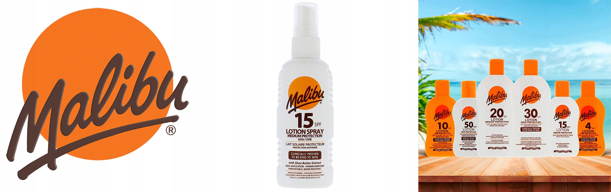 Ви шукаєте зручний захист від сонця щодня? ☀ Малібу Сонце лосьйон спрею SPF15 - це легкий, водонепроникний спрей, який забезпечує середній рівень захисту проти УВА та УФБ випромінювання.