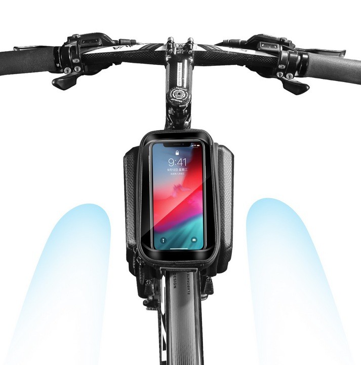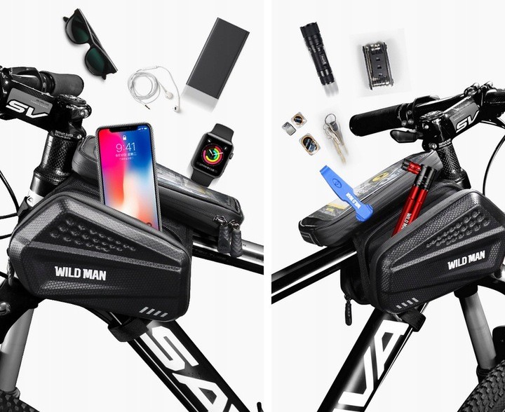 Велосипедна сумка 2 в 1 від Wild Man, яка служить водонепроникним чохлом для телефону та зберіганням для всіх видів дрібних предметів. Прозорий сенсорний екран із термопластичного поліуретану, який забезпечує понад 90% чутливості до дотику.