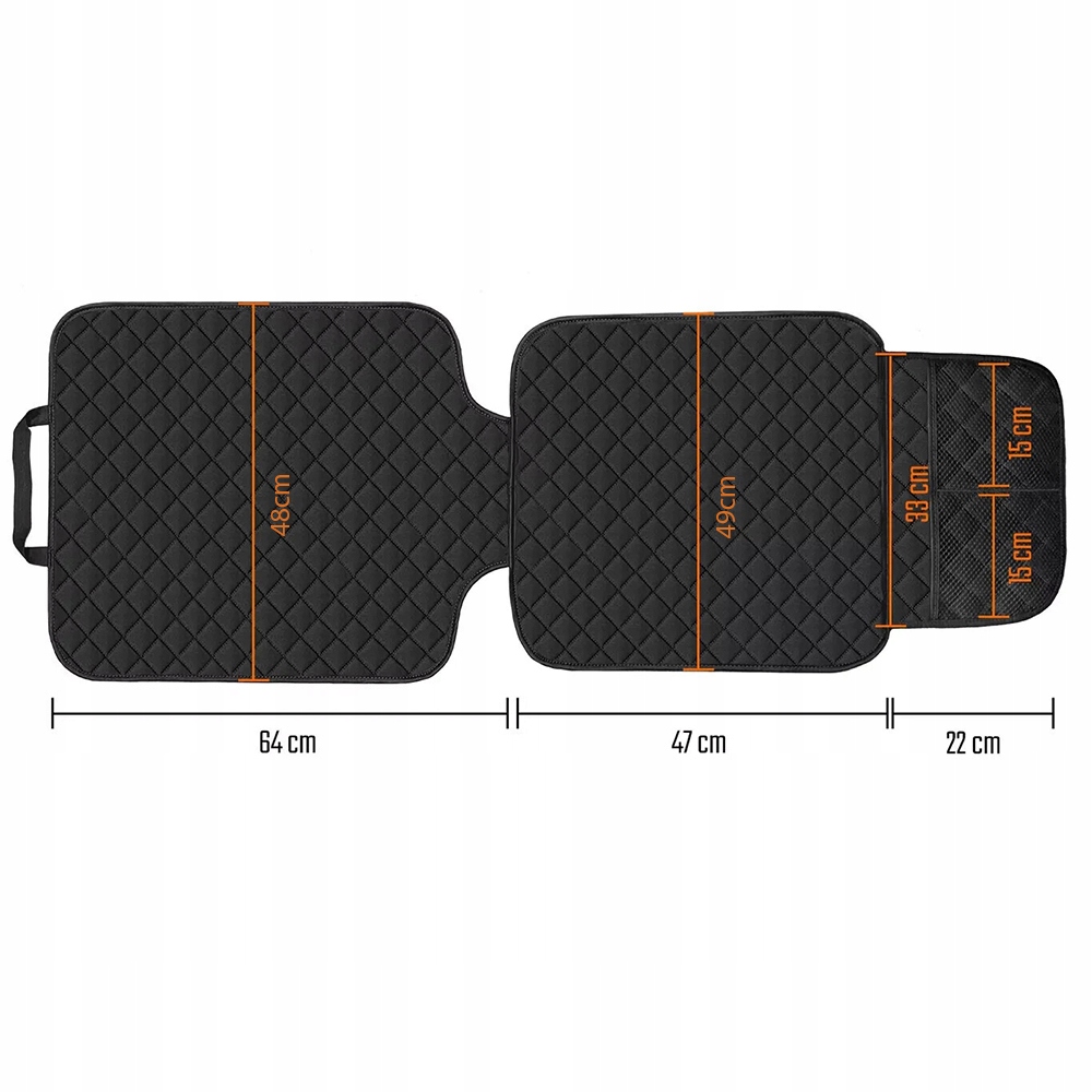 Розміри сидіння 49 х 47 см і спинки 48 х 64 см (ширина х довжина) забезпечують ідеальний захист сидіння, а протектор універсальний і сумісний практично з усіма марками і моделями автомобілів. У зоні ніг є дві практичні кишені для зберігання дрібних предметів або іграшок, які мають бути легкодоступними.