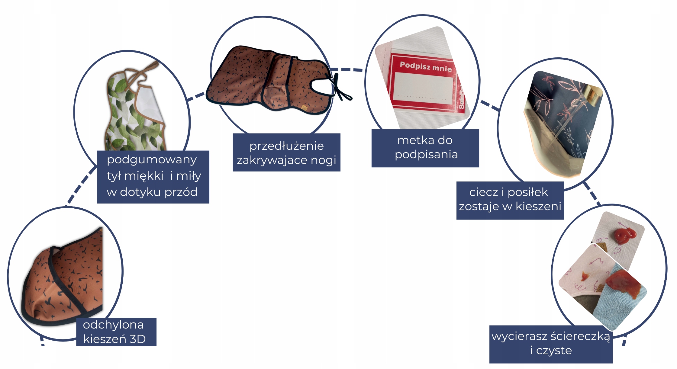 Чохол моделі, верхня частина нагрудника у формі пісочного годинника з відкидною кишенею. Нагрудник був збагачений розширенням, що закриває ноги. Це альтернатива фартухам з рукавами. Його вага набагато легший, ніж вбудований фартух, легше надягати та чистити. Подовжувач призначений для захисту нижньої частини одягу від падаючої їжі та рідини висипання столових приборів під час шляху від тарілки до обличчя. Він ідеально підходить для ознайомлення з методом BLW, навчання самостійному харчуванню, для святкувань, коли ми хочемо зберегти свій одяг чистим, а також під час ручних та художніх ігор або на кухні. Це модель, яку найчастіше вибирають ясла та дитячі садки.