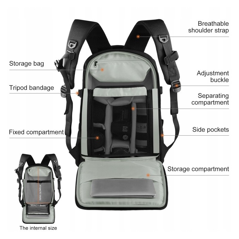 У рюкзак можна помістити фотоапарат, 2 об’єктиви, ноутбук 13-15" та інші необхідні фотоаксесуари.