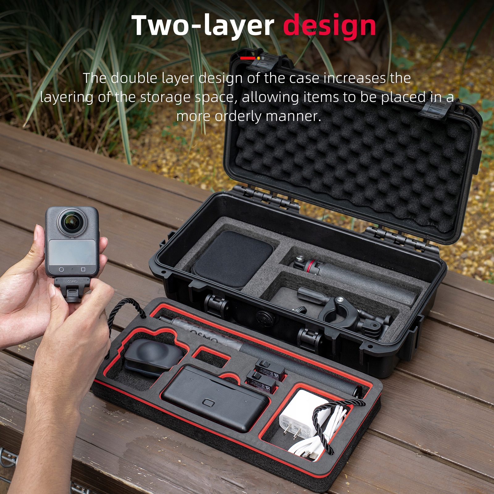 Професійна конструкція: Камери жорсткого зберігання спеціально розроблені для камер DJI OSMO 360, має двошарову структуру, забезпечує всебічне та організоване зберігання тіла камери та всіх необхідних аксесуарів. Шарерний дизайн, верхній шар розташований для камери DJI OSMO 360 (сумісна з кришкою силіконової лінзи), 6 -кратними акумуляторами, селфі -палицею, основою мейгнетизму, концентратором зарядки, ND -фільтром, кріпленням швидкого випуску та іншими аксесуарами. Нижній шар служить потужним не стандартним положенням, яке може вмістити мікрофон DJI, розширюючи полюси, селфі -полюси та інші аксесуари зі знімною дужкою для регулювання саморобки.