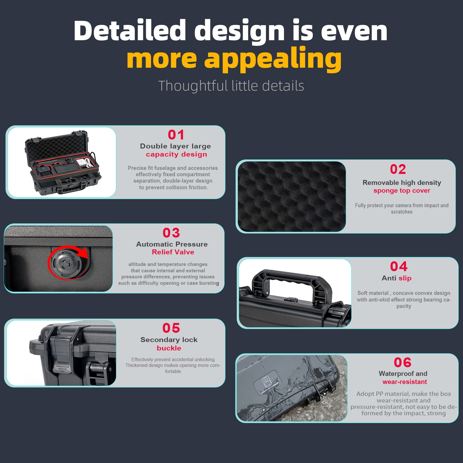 Матеріали високої якості: Зовнішня частина виготовлена з високоякісного матеріалу ПП, який стійкий до споживання та стійкого до тиску, антиколійного та анти -колісності, анти -зколу та протипадження. Дизайн клапана має хорошу ущільнювач, водостійкість та пилозахисну, IP67, гарантуючи, що камера суха та чиста; Внутрішня оболонка виготовлена з адаптованого матеріалу EVA, а верхня кришка захищена гнучкою губкою, що забезпечує вам всебічний захист.