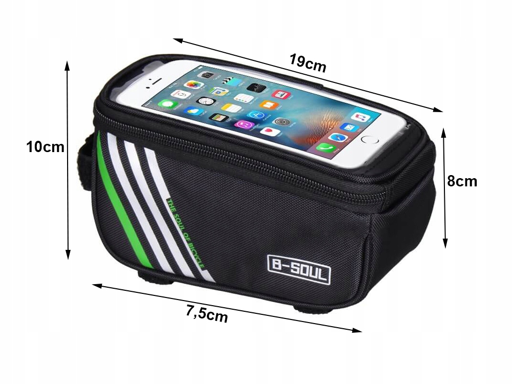 Сумка повністю посилена та виготовлена з міцного матеріалу. Зручний у використанні, він дозволяє без проблем використовувати всі функції телефону під час їзди на велосипеді. Кріпиться на раму велосипеда за допомогою регульованих застібок-липучок. Може вмістити пристрої з діагоналлю макс. 6.8'' Має відбиваючі смужки для підвищення безпеки на дорозі.