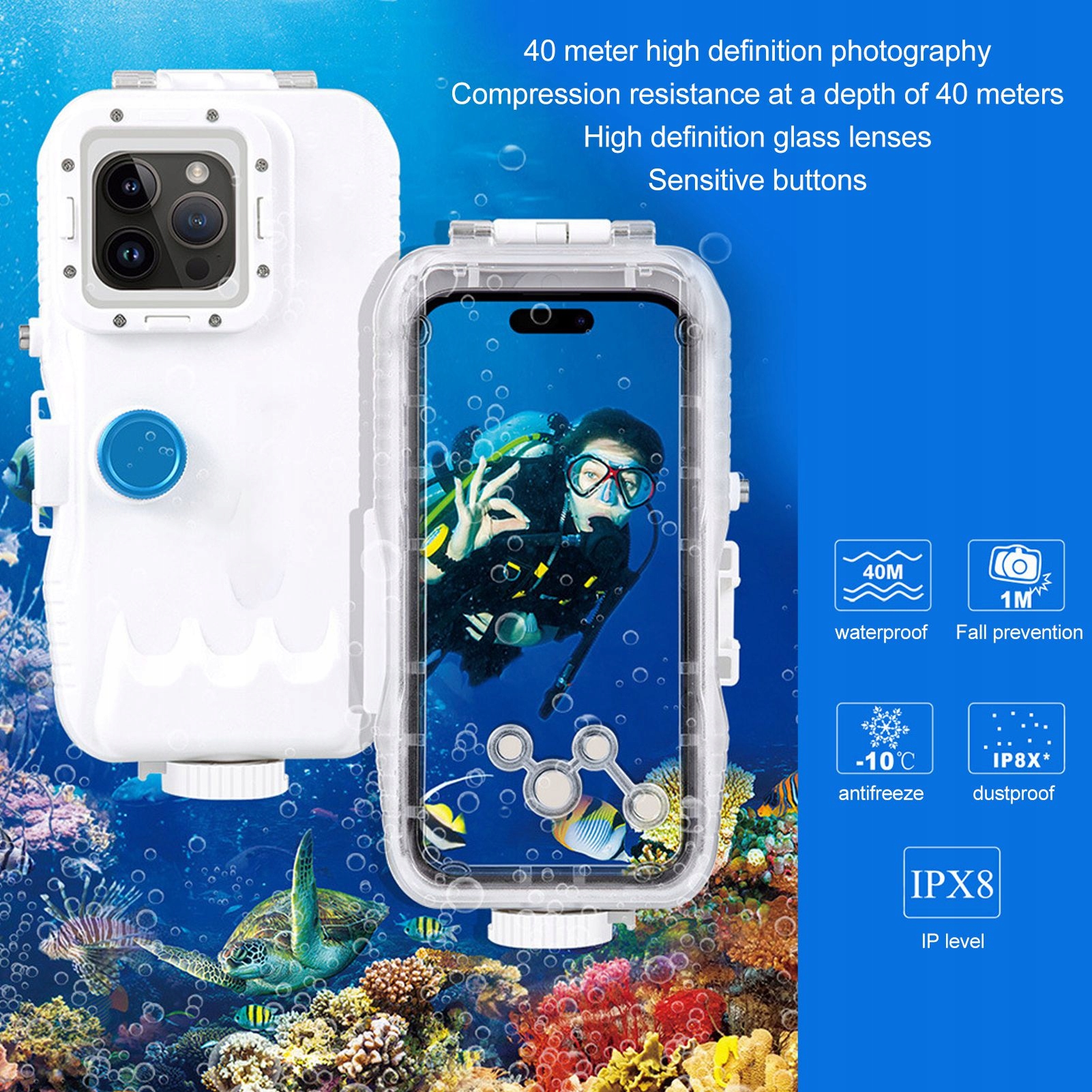 2. Дайвінг -катування: прийняття неприємностей -безперервної закритої технології, водонепроникність, капання, подряпини та бруд. Вони, як вакуумна структура клапана забезпечує кращу герметизацію та запобігає витоком води. Водонепроникний зубчастий 40 м/130 футів, підходить для підводної фотографії. Відкриття поворотного та робочого покриття, провідного контролю дотику, високої міцності та опору тиску. Щоб отримати абсолютну безпеку, спочатку ви можете провести водонепроникний випробування.