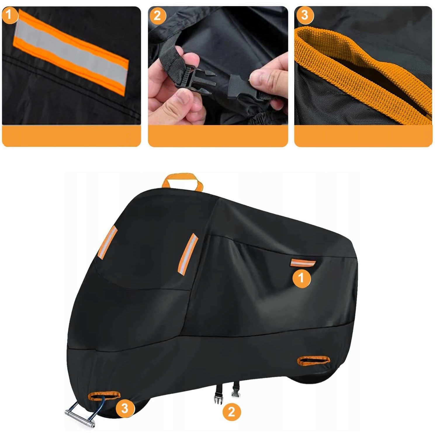 ➡ 4 світловідбиваючі ремені та світловідбиваюча ручка: Ця зовнішня кришка для мотоцикла має 4 чітко видимі світловідбиваючі смуги, 2 спереду та 2 ззаду. Верхня частина має світловідбиваючу ручку. Полегшує пошук мотоцикла в темряві. Примітка. Не використовуйте гострі декоративні елементи, оскільки це може спричинити розрив мотоцикл. Сильний вітер.