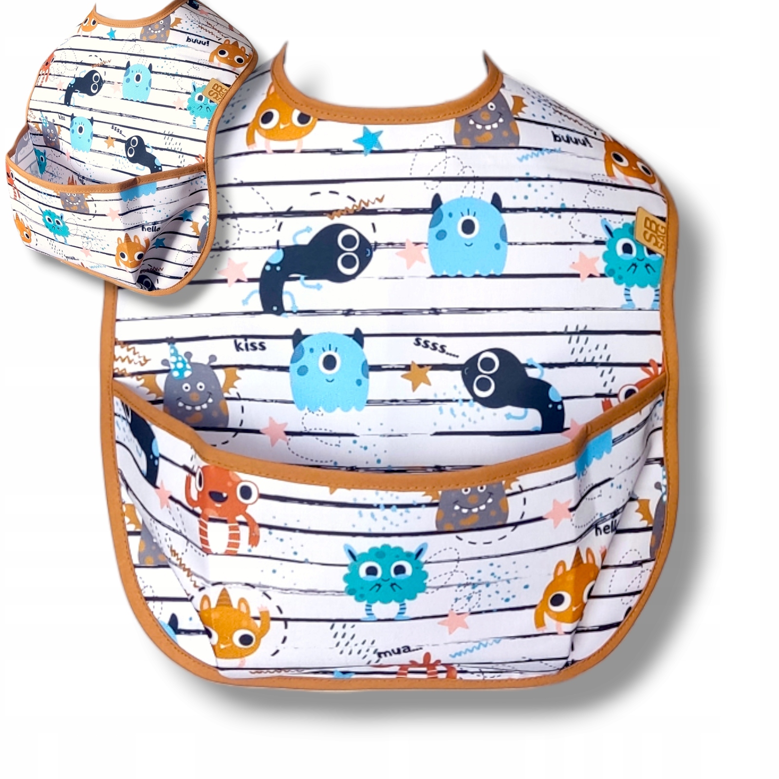 - Привабливий малюнок: Веселі монстрики в яскравих кольорах - синьому, помаранчевому, чорному та сірому - привернуть увагу дитини, зроблячи носіння нагрудника одним із задоволенням.