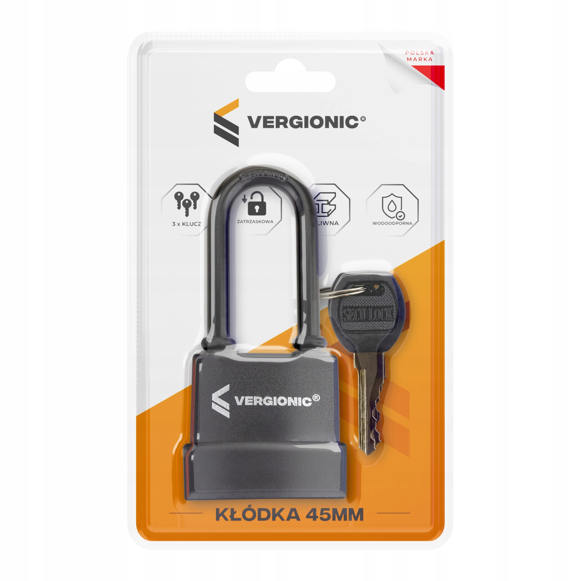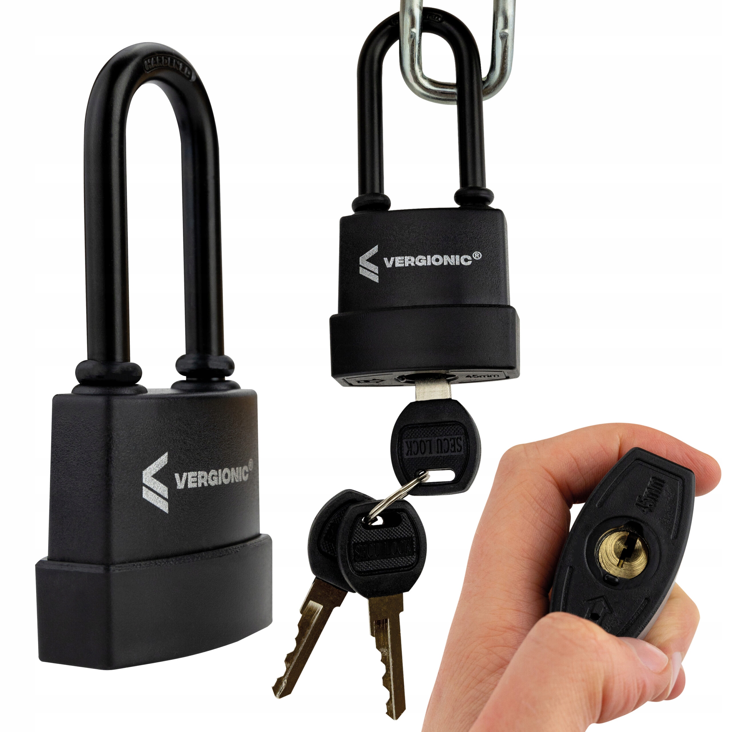 Навісний замок характеризується високою міцністю. Корпус навісного замка виготовлений зі сплаву чавуну. Він стійкий до корозії, пошкоджень і ударів, навіть з важкими предметами. Додатково корпус захищений пластиковим корпусом, що значно підвищує його довговічність. Хвостовик 6,8 мм, завдяки виготовленню із загартованої сталі, стійкий до розпилювання. Має гумовий захист для запобігання потрапляння води в механізм, а також засувку під ключ. Пропонований навісний замок є навісним, що означає, що його можна закрити навіть після вилучення ключа. Замок поставляється з 3 однаковими ключами, які можна розділити між кількома відповідними, довіреними людьми. Якщо навісним замком користується одна особа, рекомендуємо захистити решту ключів, щоб вони не потрапили в чужі руки.