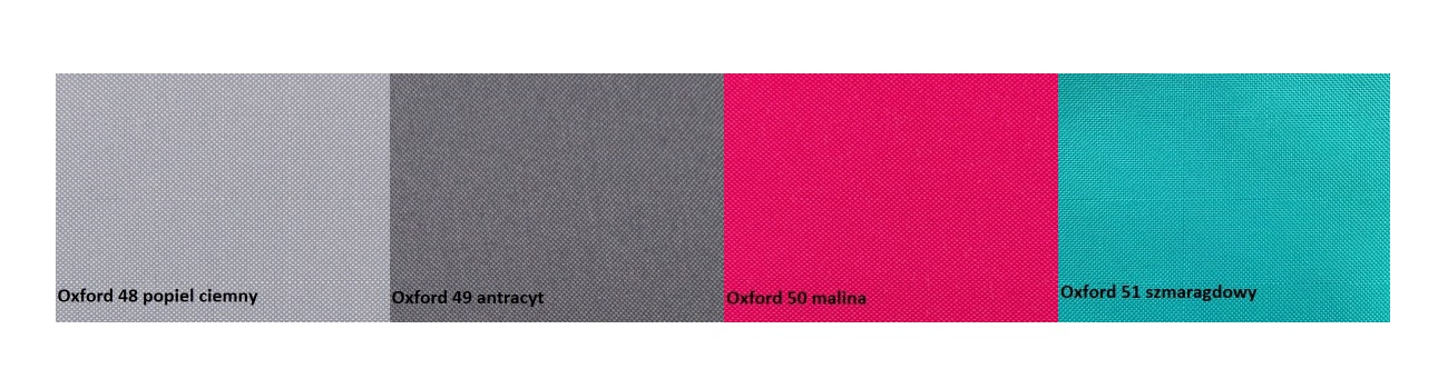Тканина OXFORD також легка для чищення - плями та бруд видаліть м'якою губкою та розчином води та мила (температура 30ºC) або м'якими миючими засобами. Не використовуйте агресивні хімікати, що містять розчинники та відбілювачі.