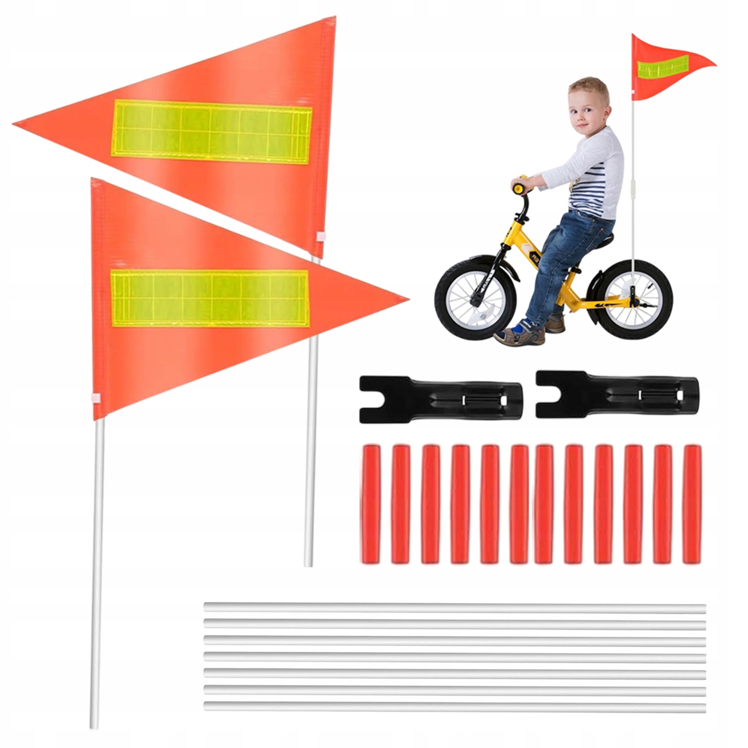 - Ви отримаєте 2 велосипедні прапори, 7 щогли склопластику, 2 металеві частини, 12 роз'ємів щогли (щоб прапори були більш ефективними).