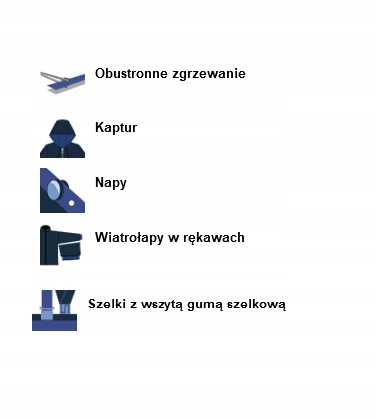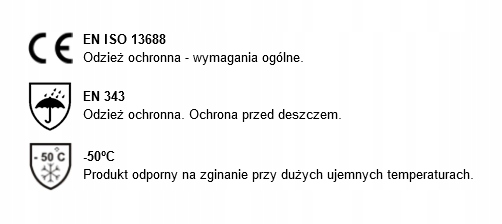 Одяг, що складається з куртки з капюшоном, що застібається на застібки, і комбінезона з регульованими підтяжками та широкою гумкою ззаду. Модель виготовлена з водонепроникної тканини Plavitex, призначена для використання в несприятливих погодних умовах. Забезпечує ефективний захист від вітру та дощу. Водонепроникне покриття запобігає проникненню вологи. Технологія двостороннього зварювання підвищує міцність швів. Продукт відповідає нормам європейських стандартів: EN ISO 13688 та EN 343.