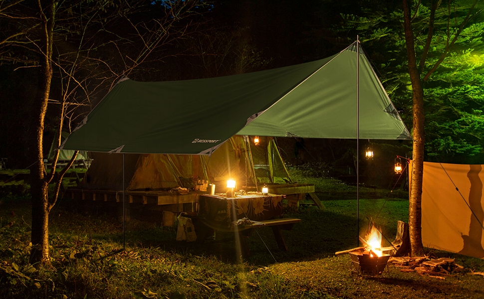 - Водонепроникний та стійкий до ультрафіолетового випромінювання: водонепроникний брезент виготовлено з поліефірної тканини 210T, яка є стійкою до вітру та розривів, а також має ПУ водостійкість 3000 мм. Кемпінговий брезент також є стійким до ультрафіолетового випромінювання, щоб захистити вас від сонця під час використання на відкритому повітрі.