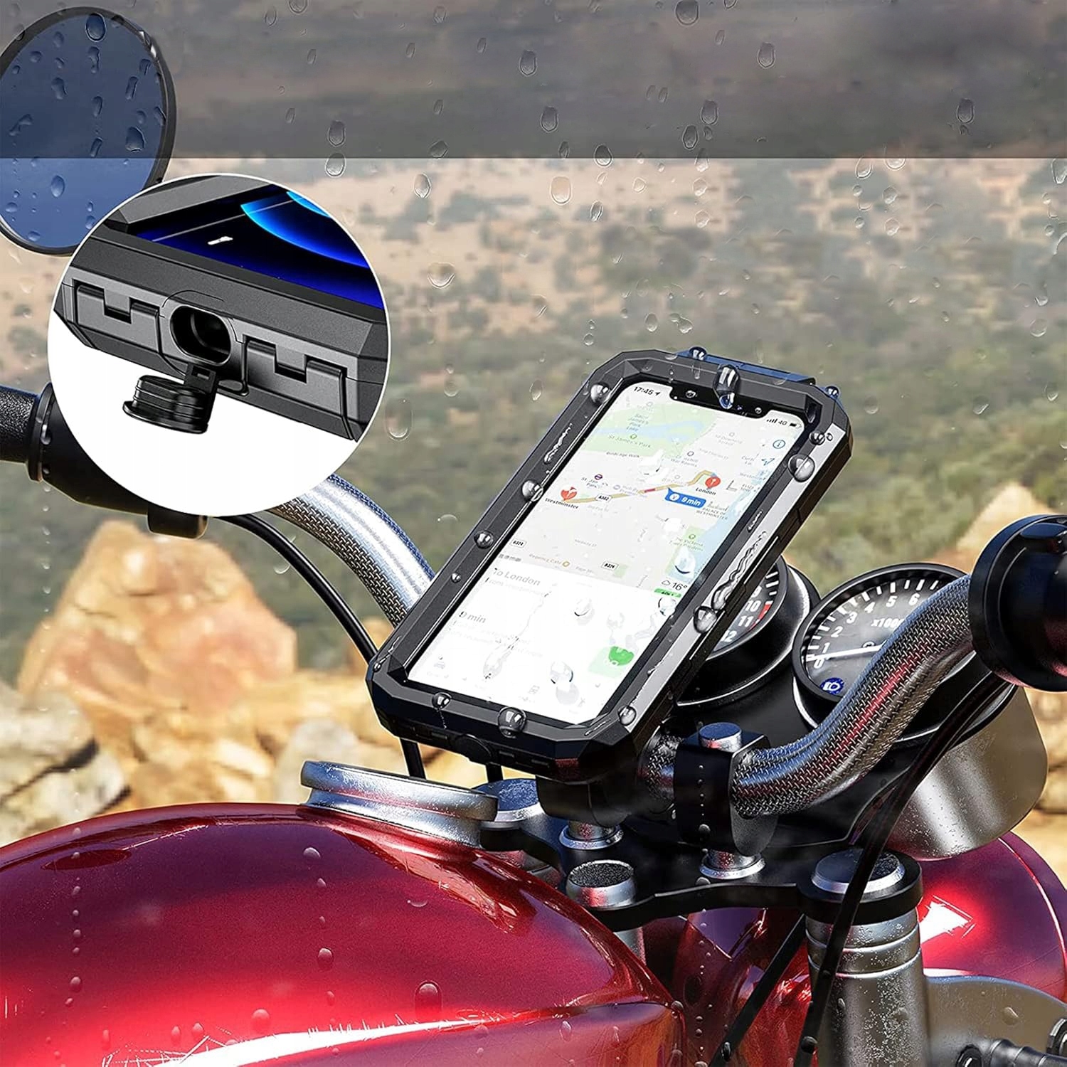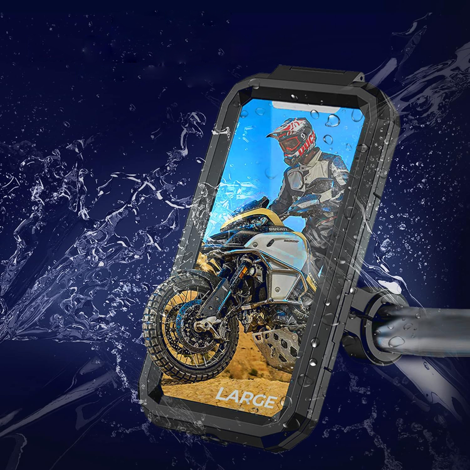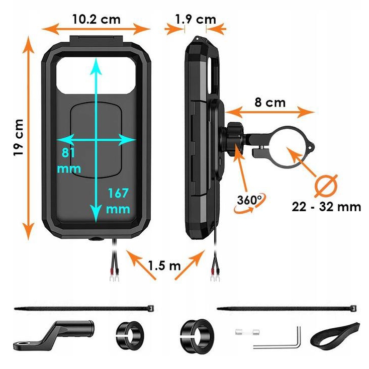 Водонепроникний футляр і тримач керма. Весь комплект виготовлений з матеріалів найвищої якості. Ідеально підходить для мотоциклів і велосипедів.