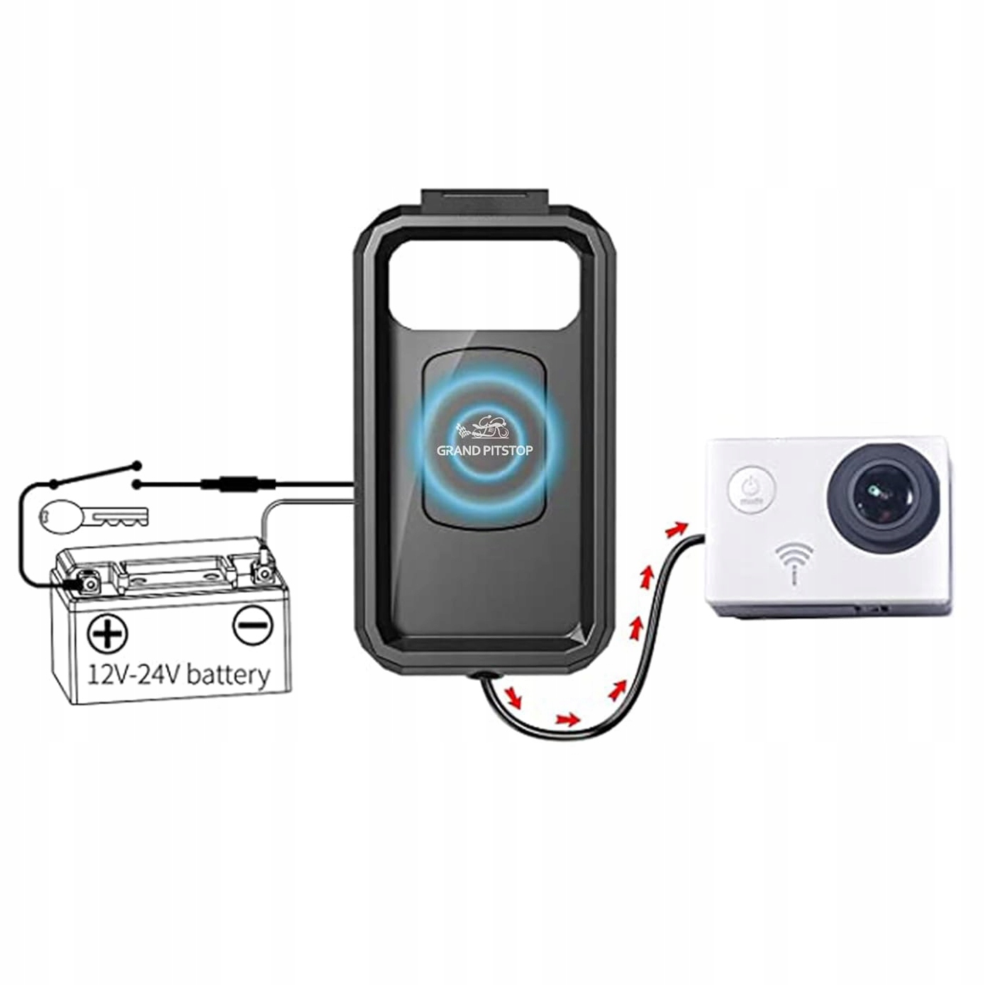 Тримач має вбудовану індуктивну зарядку Qi потужністю 15 Вт і додатковий порт USB-C. Інтегрований кабель має довжину 150 см і дозволяє пряме підключення до акумулятора. Гніздо USB-C закривається гумовою кришкою, яка захищає від води. На задній панелі також є вбудований перемикач, а в комплект також входить запобіжник. Ви можете заряджати камеру чи інше обладнання під час руху через порт USB-C.