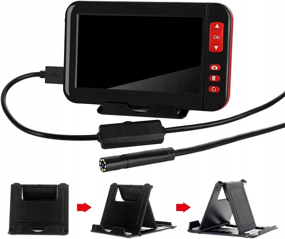 Ідеально підходить для перевірки двигунів автомобілів, човнів і літаків, засмічених водостоків, механічних пристроїв та інших пристроїв. Кабель можна згинати та зберігає свою форму, щоб отримати доступ до різноманітних вузьких місць, таких як кухня, кондиціонер тощо. Пристрій можна заряджати за допомогою зручного та легкого у використанні зарядного пристрою USB. 43-дюймовий повнокольоровий РК-екран для перегляду тестових відео в реальному часі. Пристрій має тонкий зонд із 8 регульованими світлодіодами, головка камери та кабель водонепроникні.