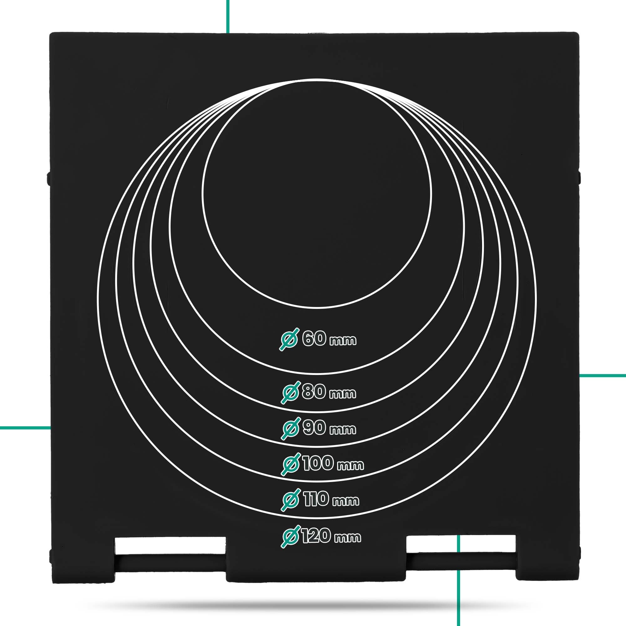 Нижній відстійник можна адаптувати майже до будь-якої дренажної труби - просто виріжте відповідний отвір залежно від ваших потреб. Діаметри від ⌀60 мм до ⌀120 мм точно позначені на дошці, що гарантує швидкий і зручний монтаж.