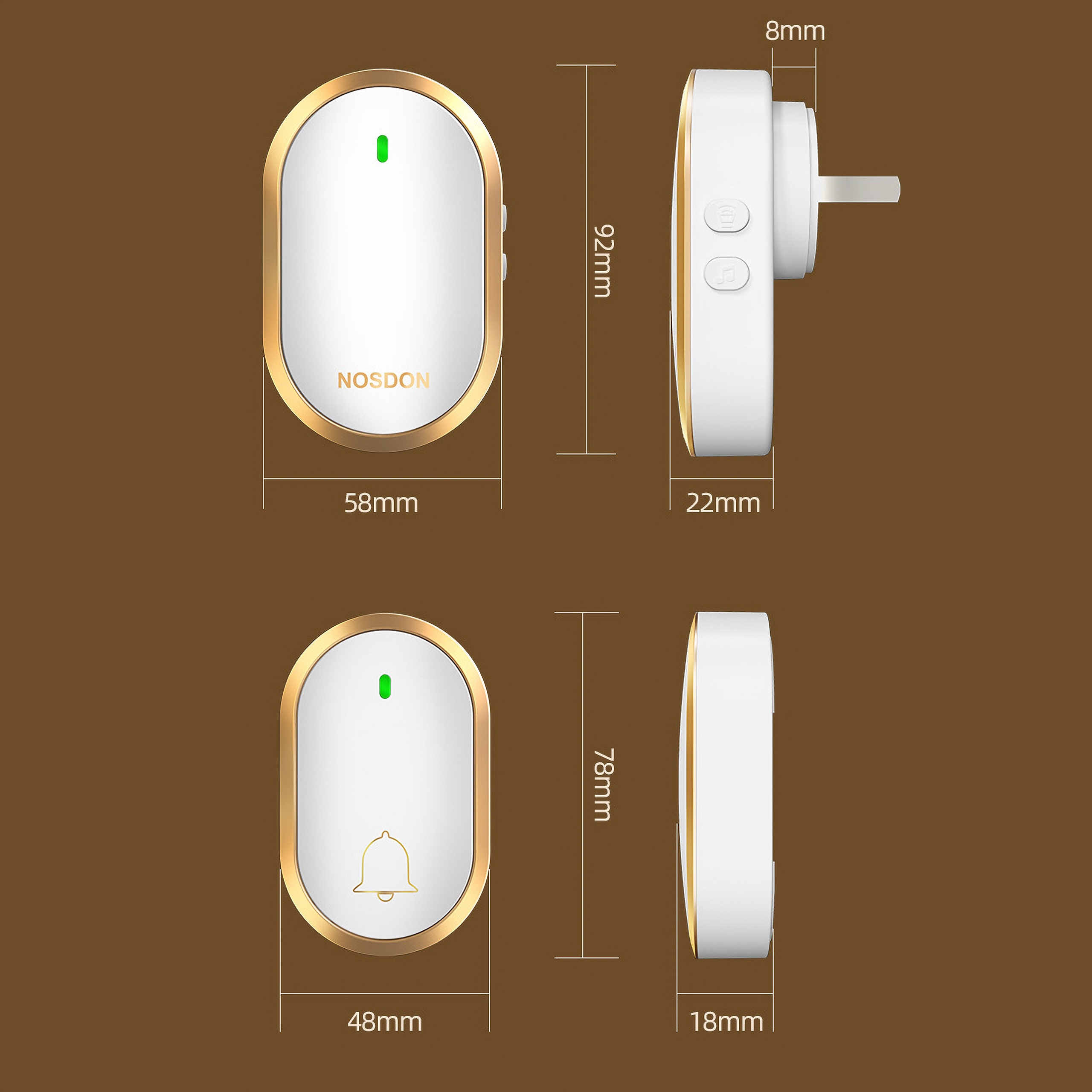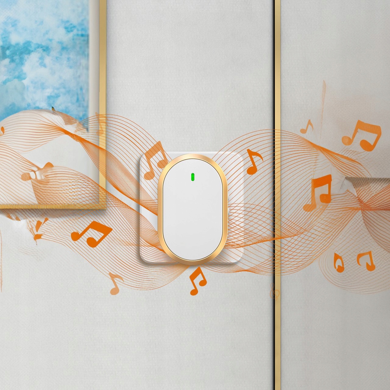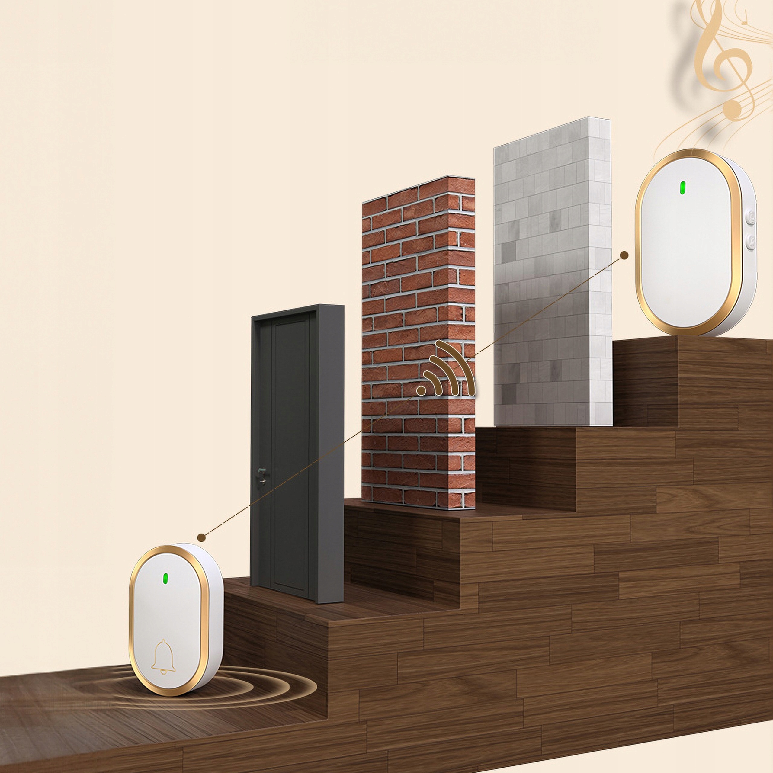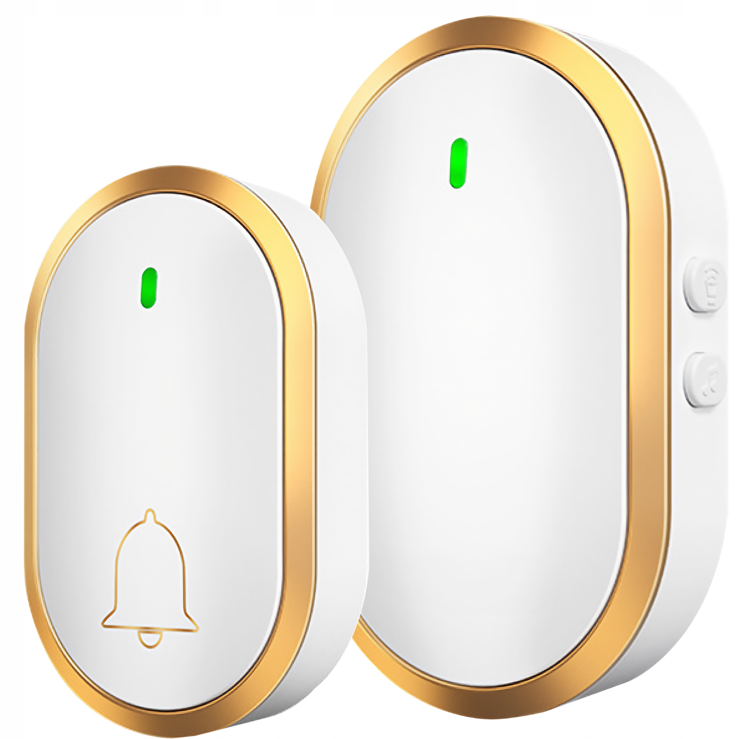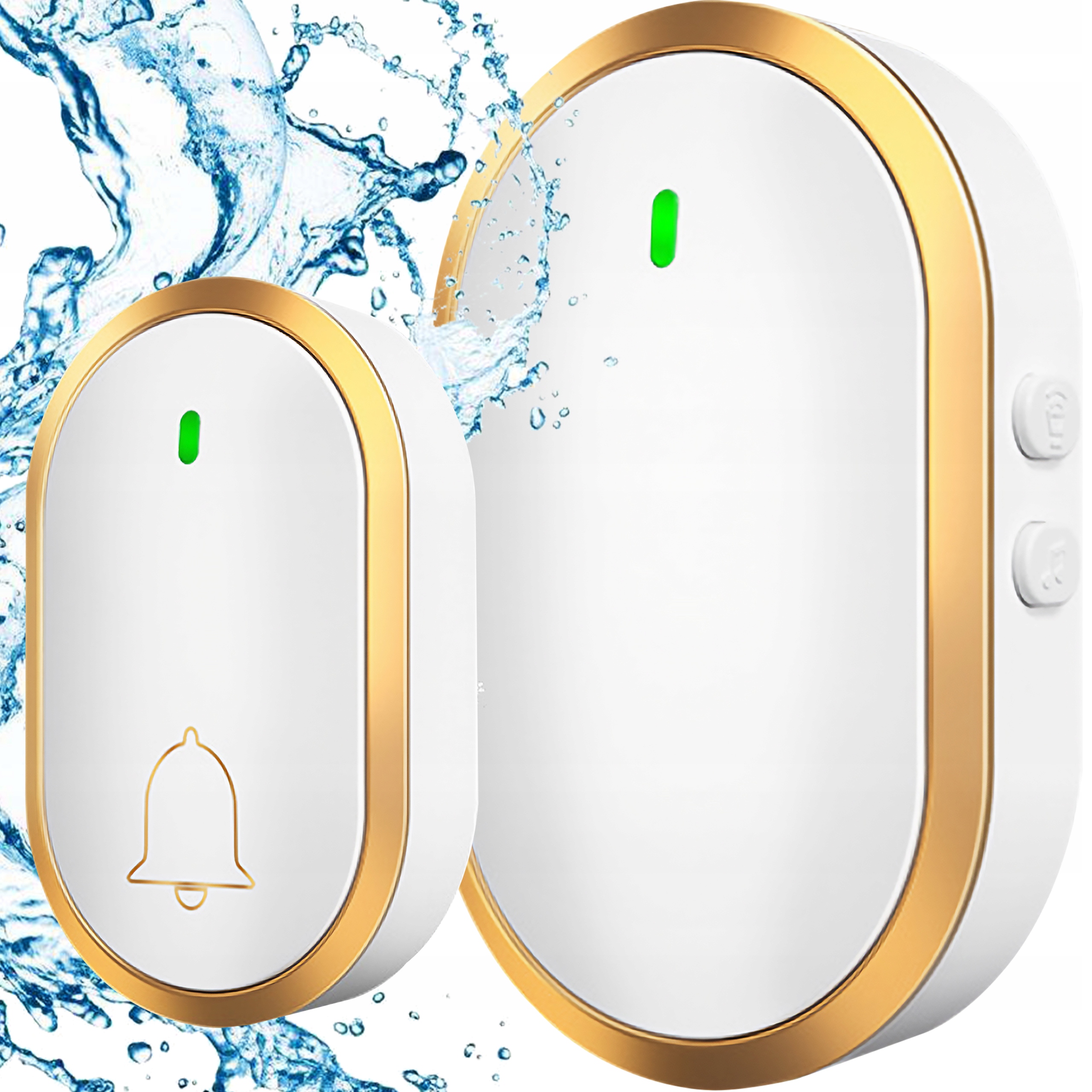 Бездротовий сучасний дверний дзвінок! Оснащений передавачем (кнопкою) з перемикачем, який не вимагає джерела живлення. Радіус дії передавача становить до 300 метрів на відкритому просторі, що дозволяє використовувати його навіть як дзвінок на ворота. Кнопка дзвінка є водонепроникною, тому її можна встановити поза будівлею.