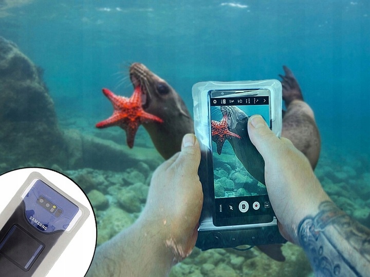 Прозора частина на задній частині чохла дозволяє занурювати телефон і робити фото під водою!