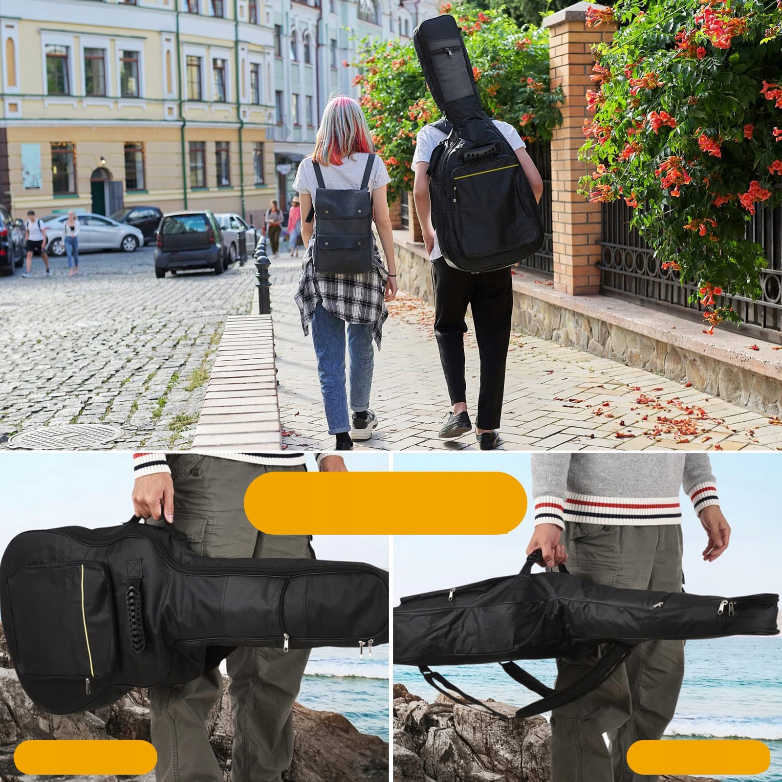 【Стиль подвійного носіння】Чохол для гітари оснащено регульованими лямками для рюкзака та ергономічними посиленими ручками, що робить його зручним і практичним. Він також має дві передні кишені, які забезпечують достатньо місця для гітарних аксесуарів.