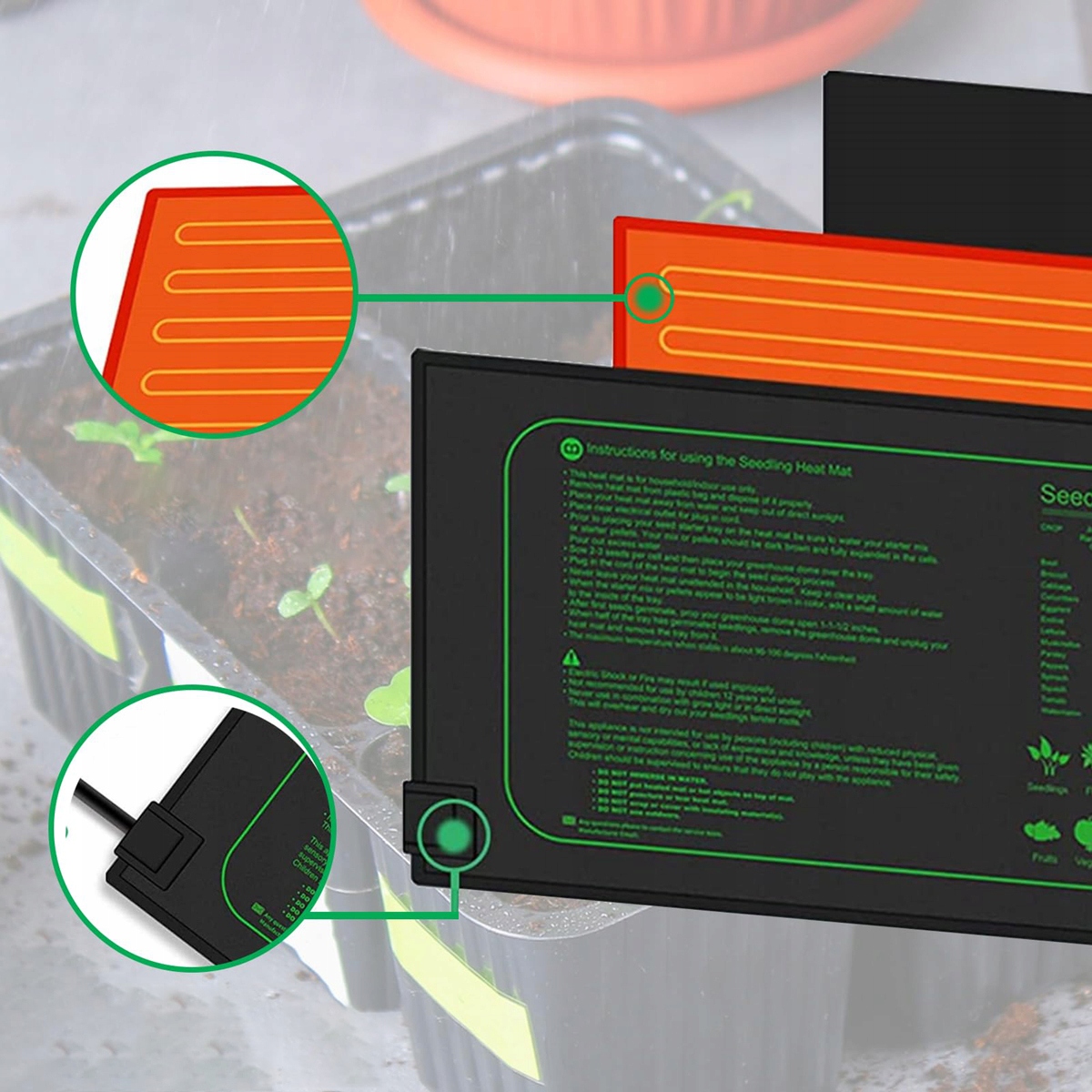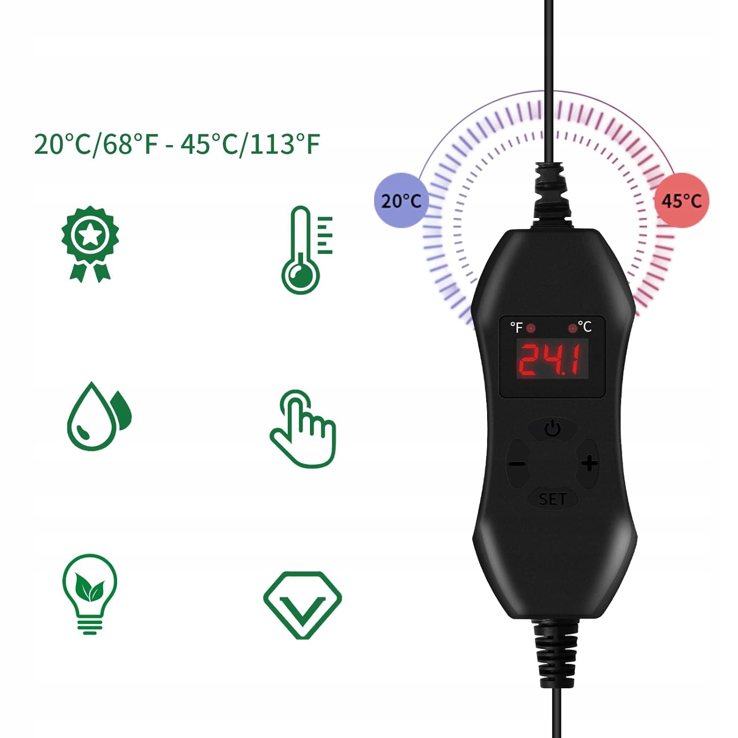 ⭐Контроль температури: можливість встановити температуру від 20°C до 30°C робить килимок ідеальним для різноманітних рослин і стадій росту. Користувач може регулювати температуру відповідно до своїх потреб, що забезпечує оптимальні умови для рослин і рептилій.