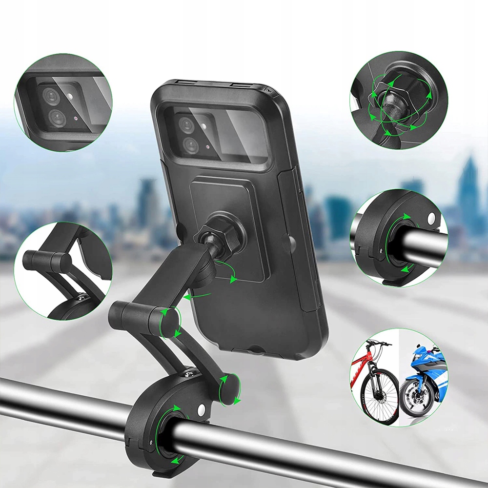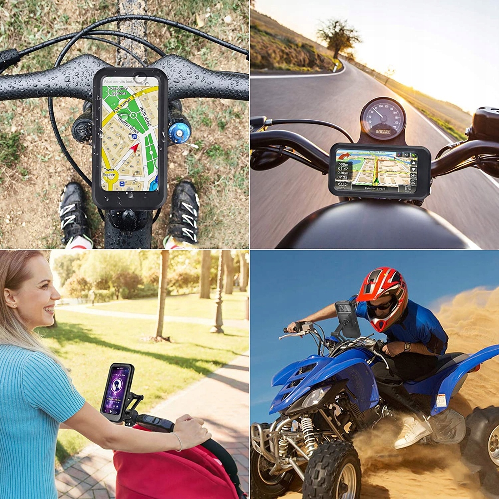 Тримач чудово працюватиме не лише на велосипеді, він також може кріплення на самокаті, самокаті, мотоциклі, квадроциклі чи дитячій колясці мати матиме легкий доступ до свого телефону під час прогулянки з дитиною.