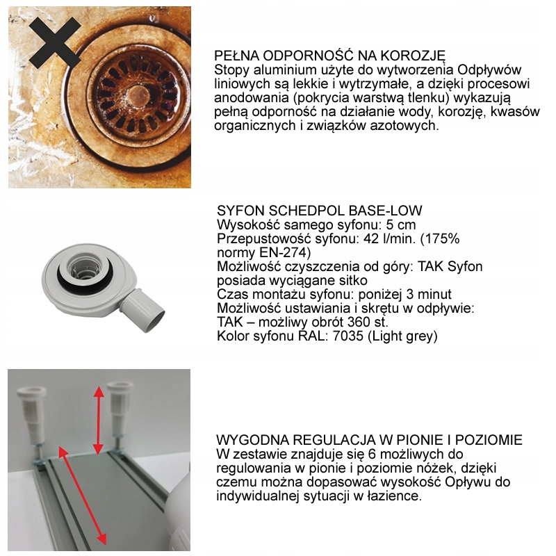 - алюмінієві сплави, які використовуються для виробництва лінійних стоків, легкі та міцні, а завдяки процесу анодування (покриті шаром оксиду) вони стійкі до води, корозії, численні органічні кислоти та сполуки азоту