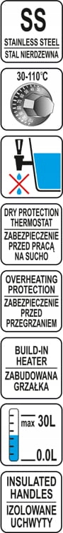 Висока якість обробки поєднується з надійністю завдяки використанню дуже ефективних нагрівачів і спеціальної системи безпеки. Нагрівач потужністю 3000 Вт розташований під дном плити. Це рішення має ряд переваг. Найголовніше - відсутність контакту з водою, щоб не утворювався накип, який з часом може призвести до перегріву та виходу з ладу. Також дуже важлива можливість легко очистити ємність і видалити з неї накип. Крім того, захист від перегріву та сухого ходу значно подовжує термін служби пристрою.