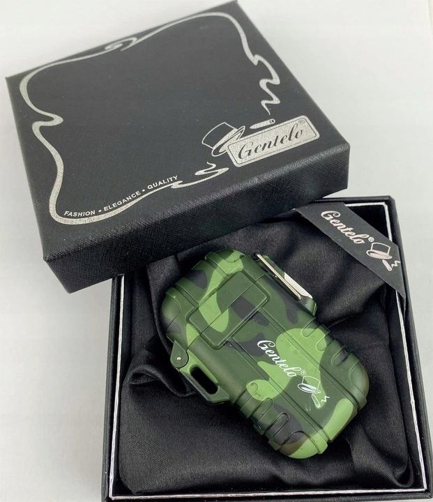 Цільна військова запальничка камуфляжного кольору. У дуже міцному корпусі є газова вставка, яку можна зняти та заправити газом. Запальничка має подвійний захист від відкриття, металеву пряжку і кнопку, що відкриває верхню кришку. Його можна прикріпити до повідка. Упакований в елегантний футляр, ідеально підходить для подарунка.